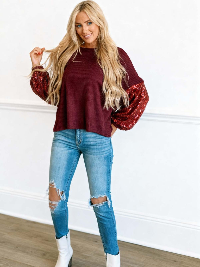 Whether you’re dressing up for a night out or adding a bit of sparkle to your everyday style, the Twisted Back Sequin Sleeve Top is your go-to for chic, effortless glam!