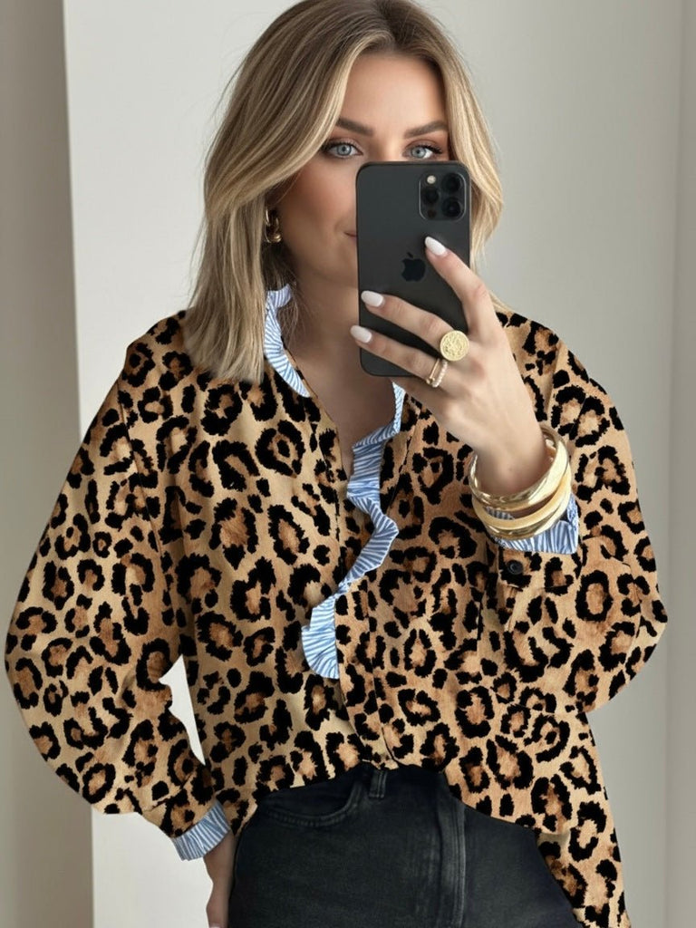 Fierce meets refined in the Wild Sapphire Button Blouse. This stunning top blends timeless leopard print with rich blue striped contrast on the collar and sleeves for a look that’s equal parts bold and polished. It’s the perfect mix of wild energy and everyday elegance — ready to elevate any outfit.