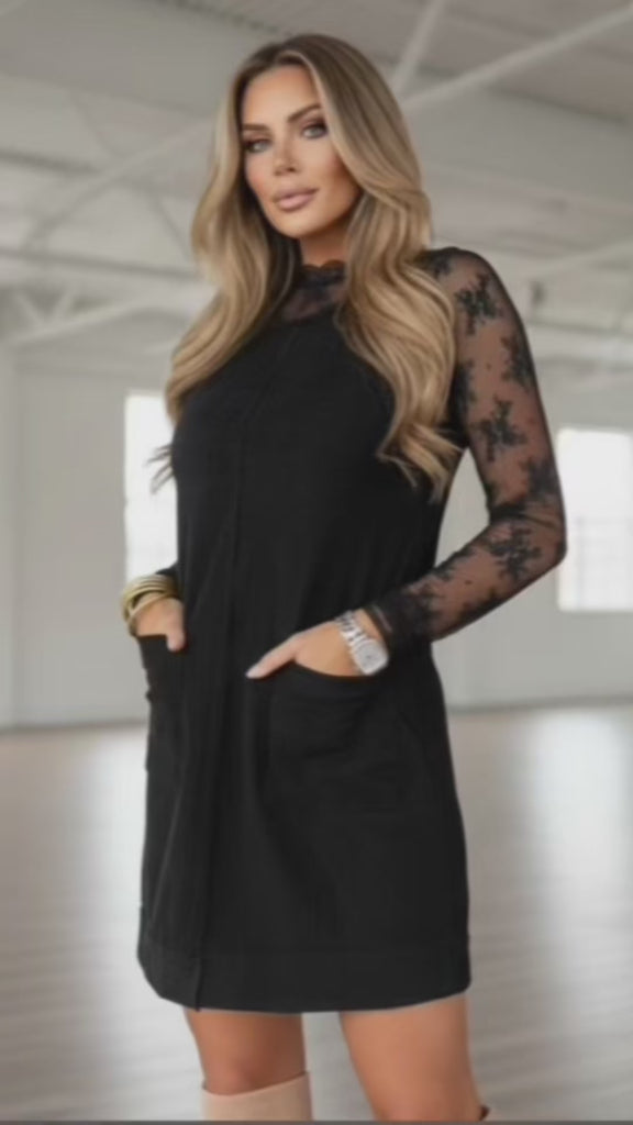 This isn’t just a dress — it’s your new effortlessly-chic secret weapon. A soft black corduroy body meets feminine lace sleeves (pair it exactly like your model look or layer your own tops underneath), giving this mini a stunning contrast of texture, edge, and romance. It’s casual enough for daytime but instantly elevates for evening plans — the definition of day-to-night dressing.