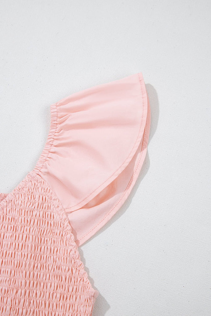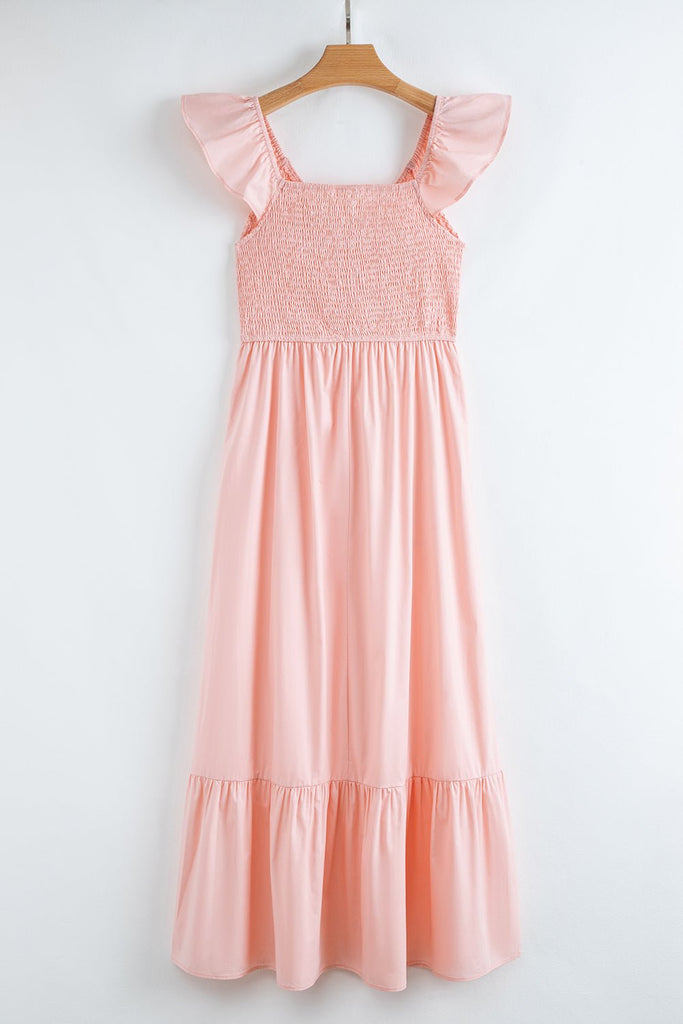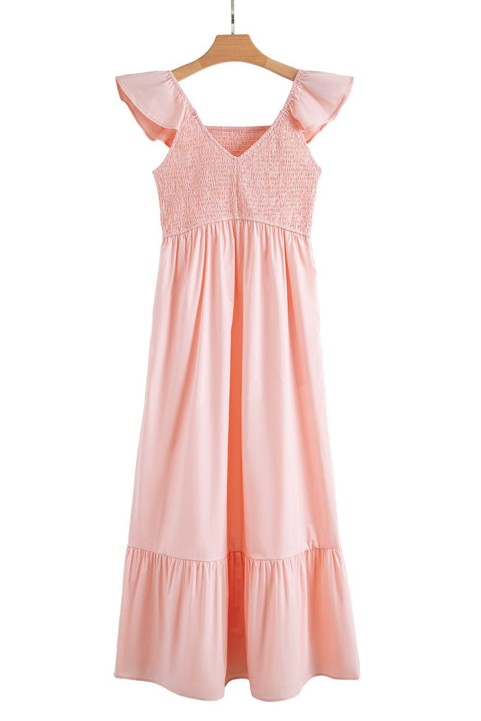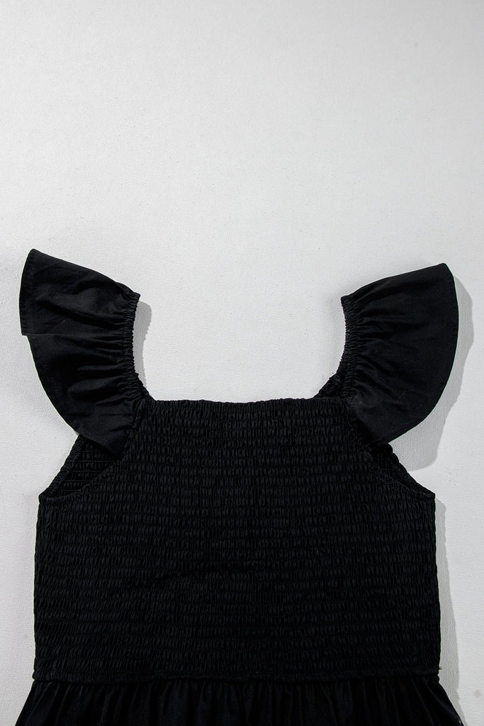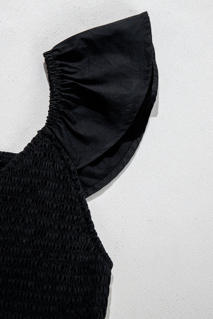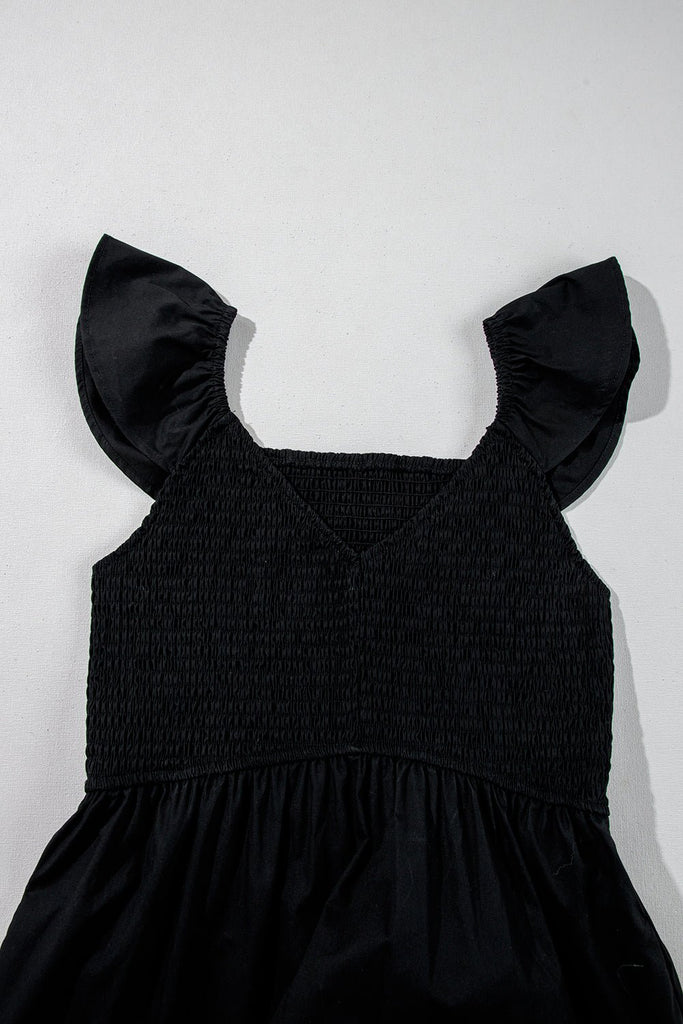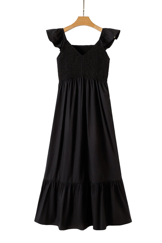 Elevate your wardrobe with the effortlessly chic Ebony Charm Dress. Designed with a flattering V-neckline and feminine flutter sleeves, this dress brings timeless sophistication to any occasion. The smocked bodice and high waist create a figure-enhancing silhouette, while the charming ruffle hem adds a playful yet elegant touch.