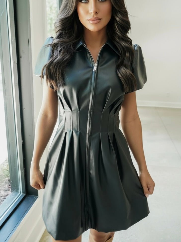 Sleek, edgy, and irresistibly chic — this faux leather mini brings major attitude with its front zip, structured pleats, and tailored waist.