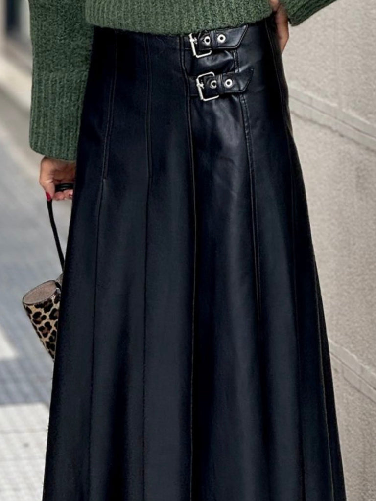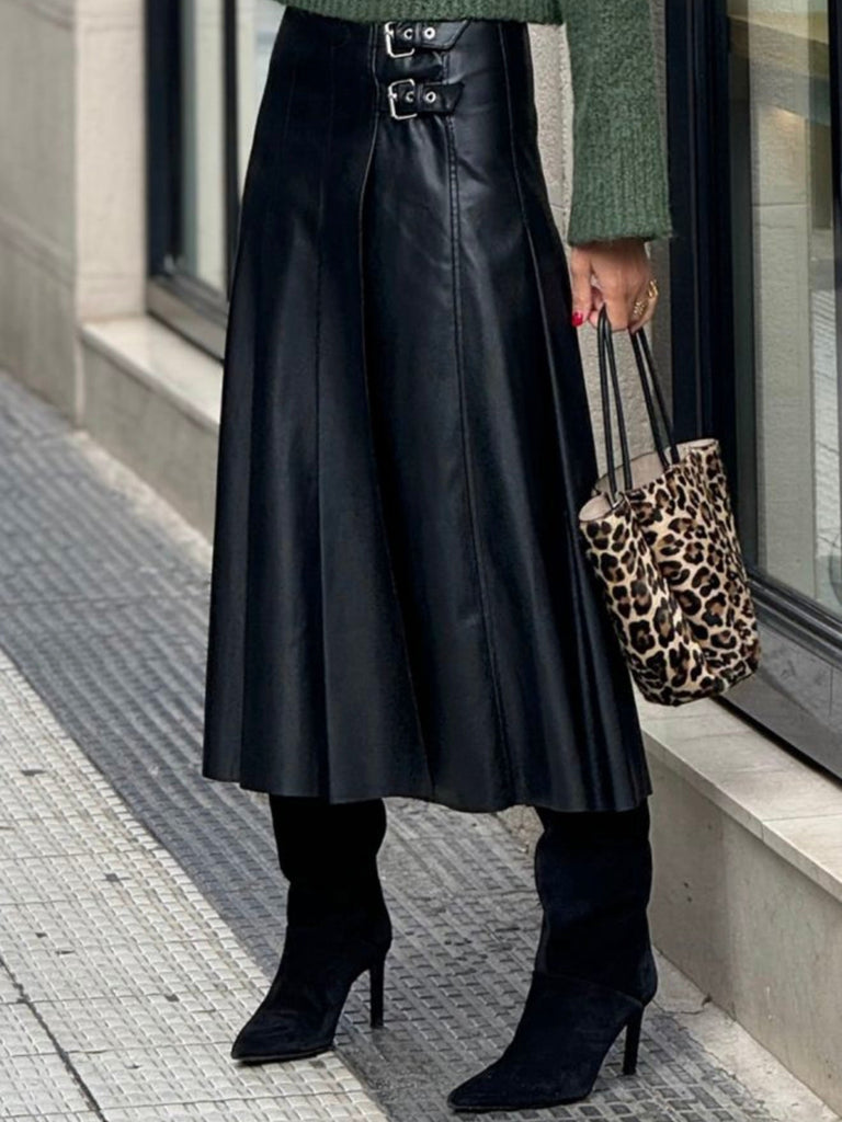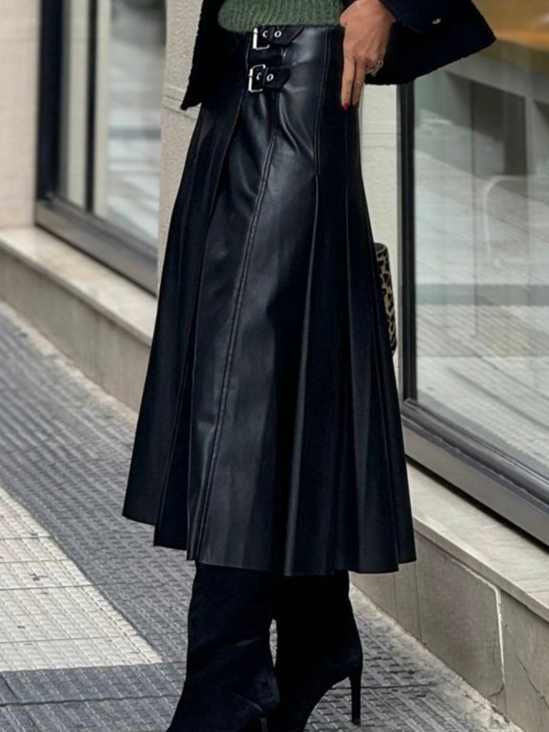 Meet the skirt that blends edgy style with timeless elegance. Crafted from luxe faux leather with buckle strap detailing, this A-line silhouette flatters your shape while giving every outfit a bold, elevated finish. Perfect for work, nights out, or when you want to feel unstoppable.