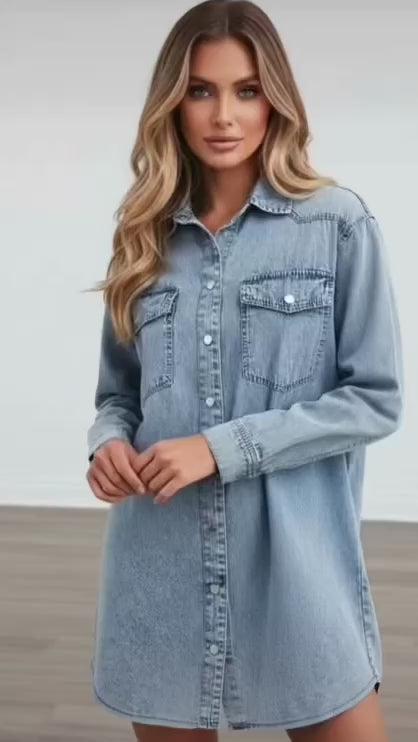 Easy, effortless, and endlessly wearable—this denim shirt dress is your throw-on-and-go staple. Designed with a relaxed fit and lived-in details, it gives you that perfectly undone look while still feeling polished. The kind of piece you’ll reach for on repeat.