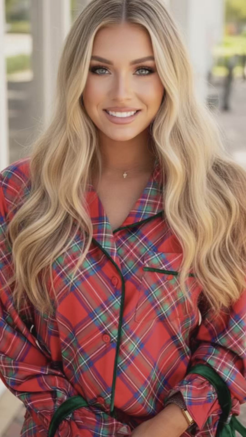 • Classic red plaid pattern with a festive, polished feel