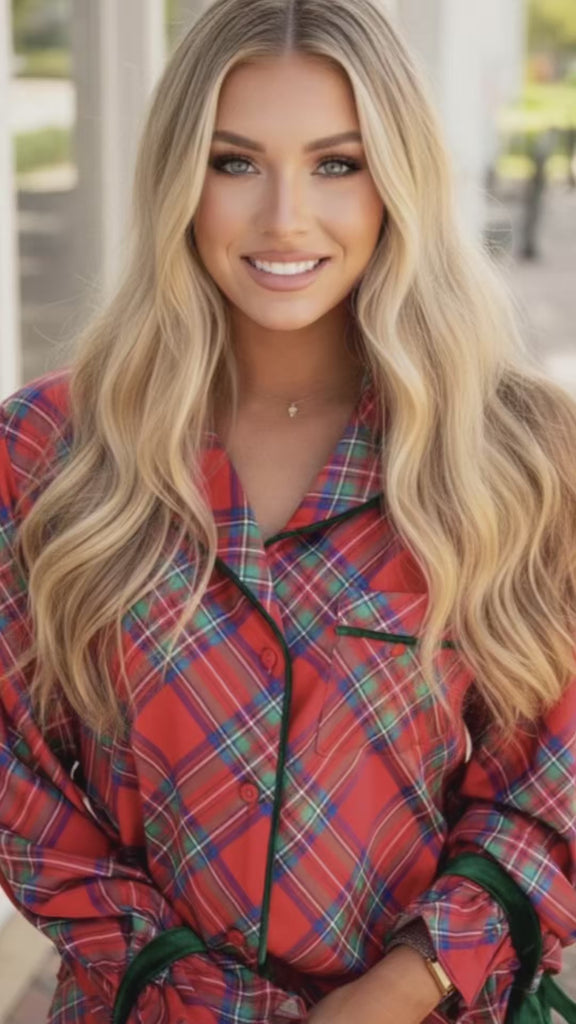 Get ready to unwind in pure holiday elegance. The Plaid Luxe Sleep Set brings a touch of boutique glamour to cozy nights and festive mornings. Made from silky-soft viscose satin with a timeless red plaid print, this two-piece pajama set features feminine ruffle hems and luxe green velvet ribbon ties for a hint of vintage charm.