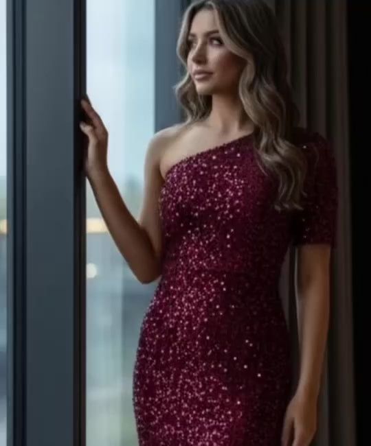 SEO Keywords: red sequin gown, one shoulder formal dress, holiday party gown, evening