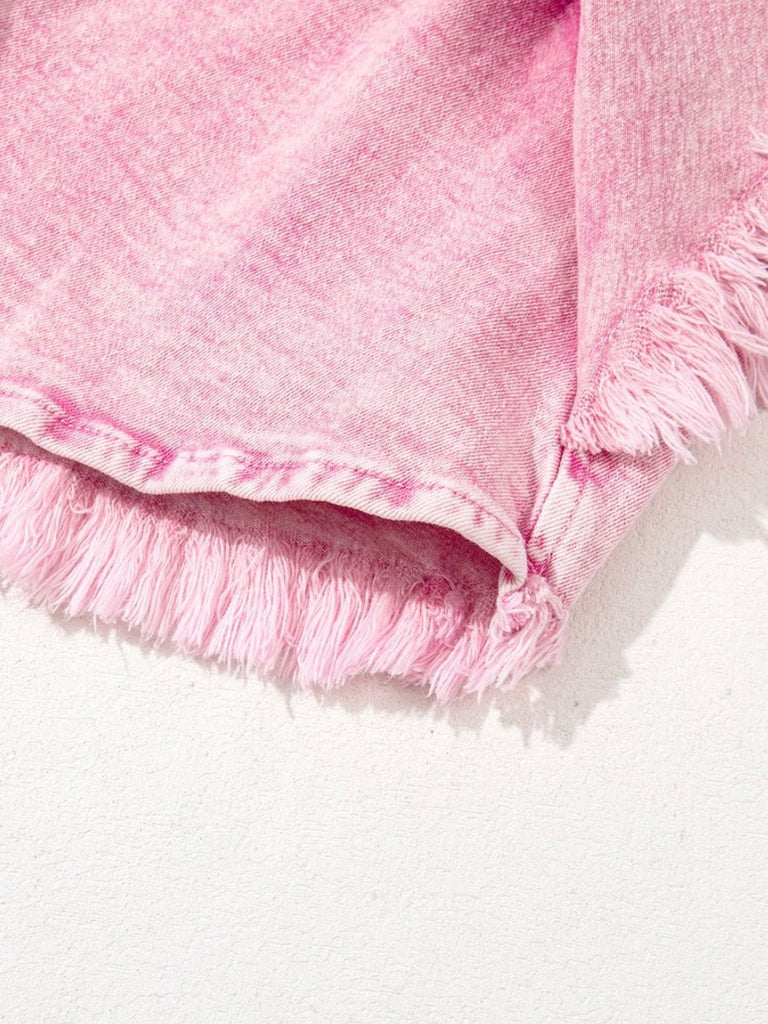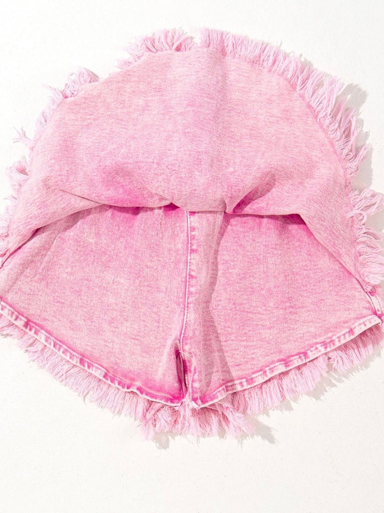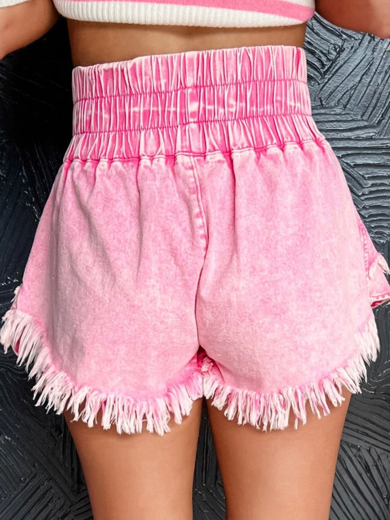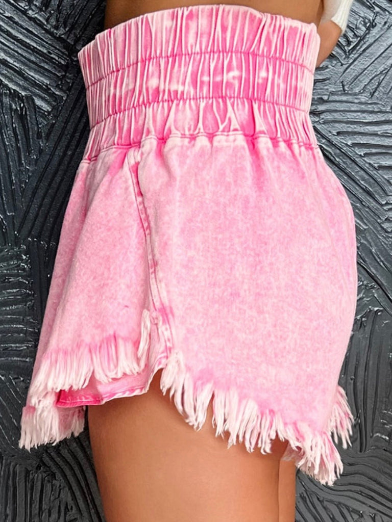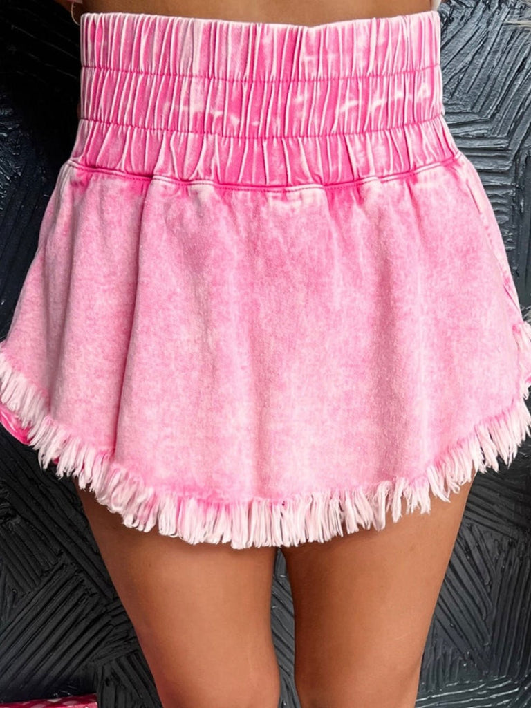 These pink mineral-washed shorts bring playful charm to your look with a high smocked waistband and fringe hem. Whether you’re pairing them with a bandeau or boots, they’re festival-ready or cute at home.