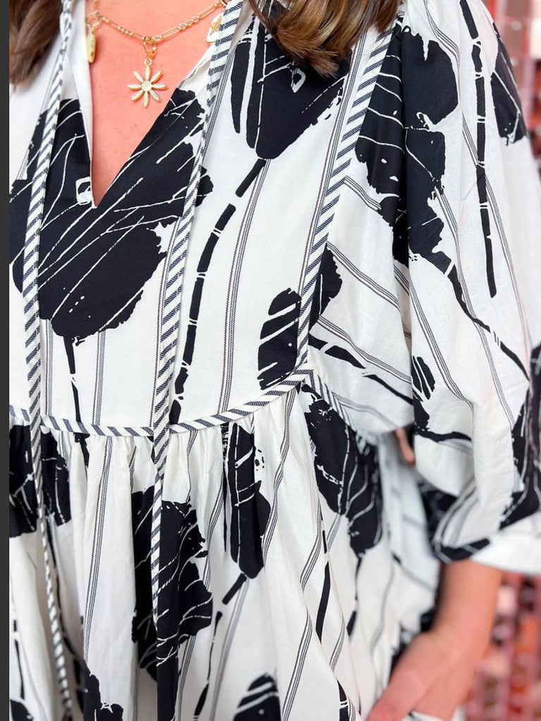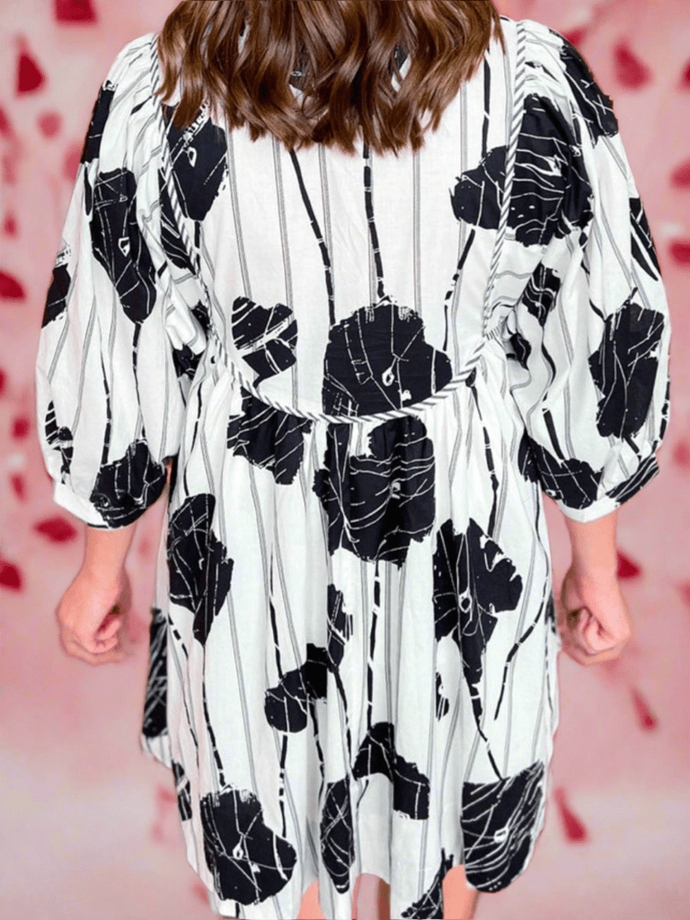 Elevate your wardrobe with the Floral Noir Mini Dress, a timeless blend of sophistication and comfort designed exclusively for plus-size figures. This chic mini dress features an elegant black-and-white floral print that exudes effortless style. The flattering v-neckline is accented with delicate strings for an extra touch of femininity, while the puff sleeves and 3/4 length provide a polished silhouette perfect for any occasion.