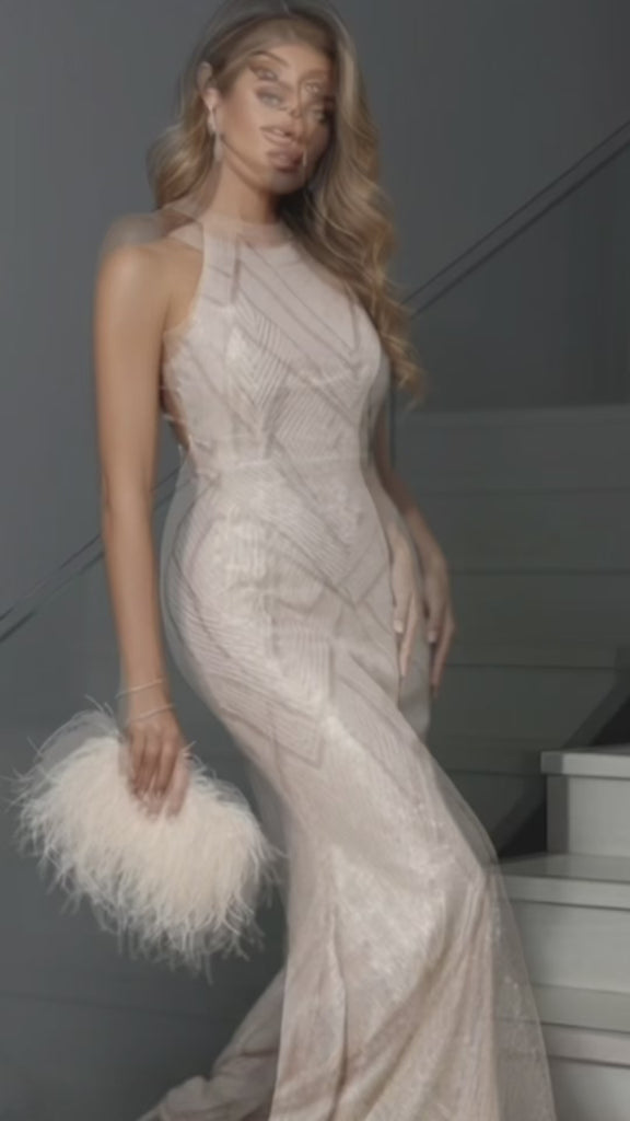 Bodycon mermaid fit that accentuates your shape. Halter neckline for secure support. Long floor length. True to size; consider sizing up if between sizes.