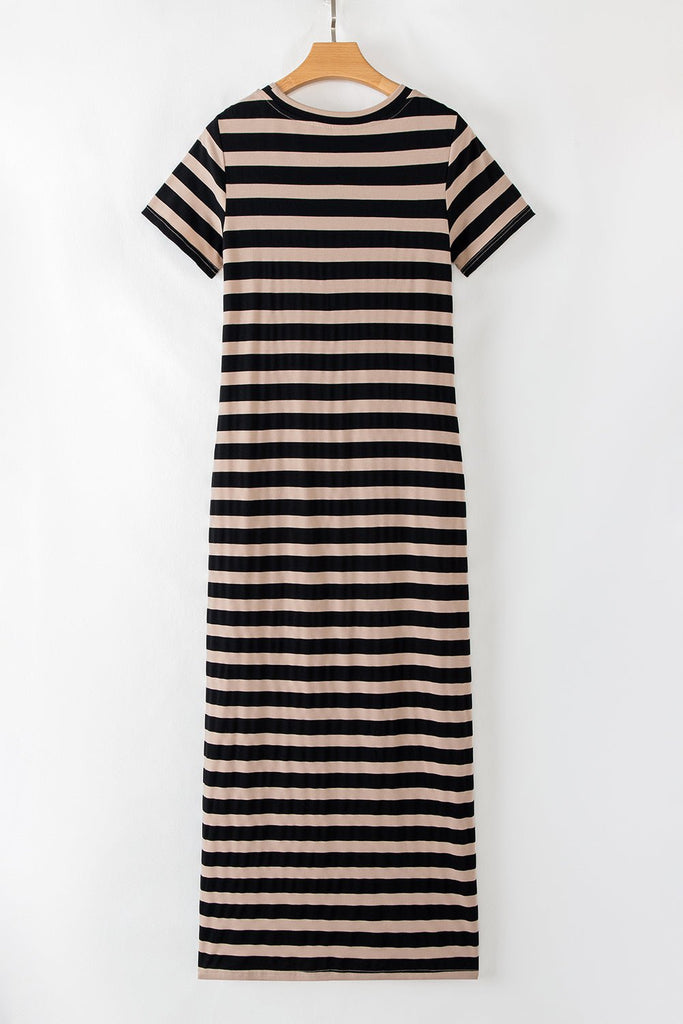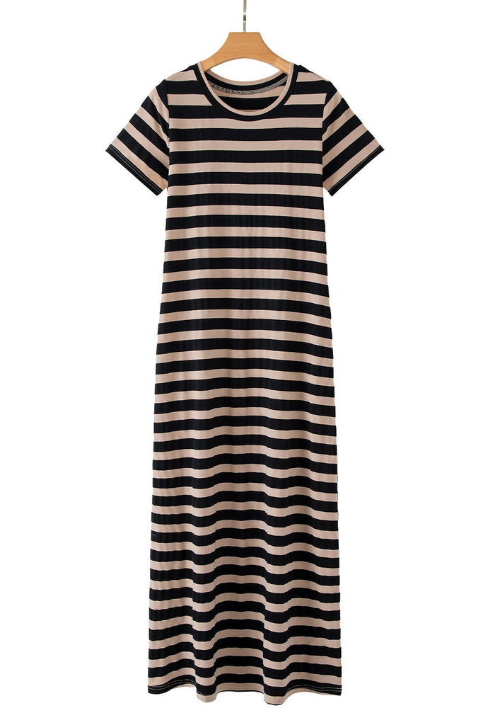 Effortless, chic, and oh-so-comfortable—the Cafe Striped Maxi Dress is the ultimate go-to for laid-back elegance. Featuring a classic striped pattern in neutral tones, this dress is designed with a flattering maxi length, a round neckline, and short sleeves for an easy, breezy feel. And let’s talk about those pockets—because fashion should always be functional!