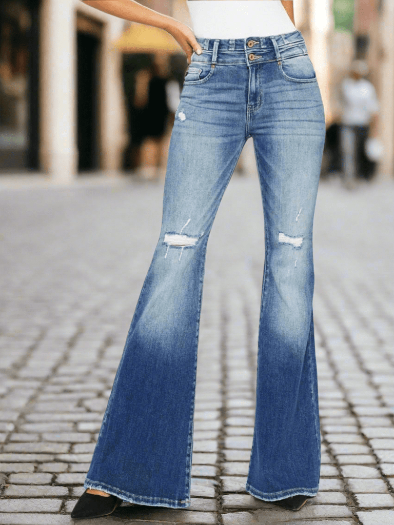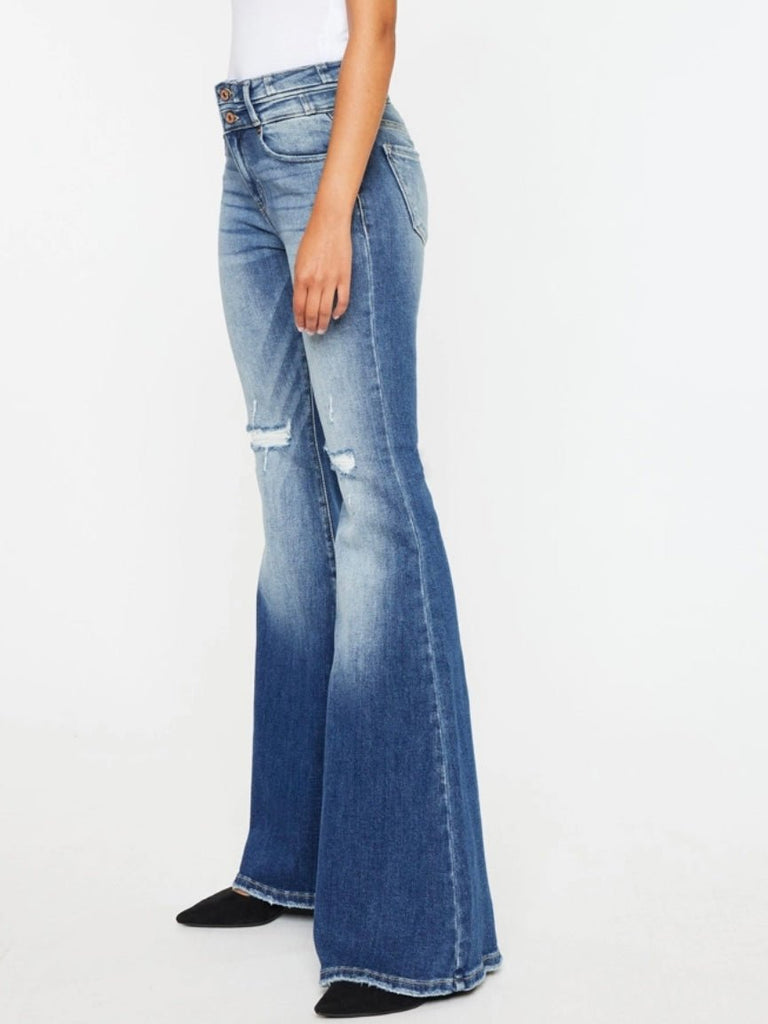 Take a bold step with the Helena High Rise Flare Jeans. These super flare jeans have a dark stone wash and a stretch fit for comfortable movement. The two button zip fly adds a unique touch, while the distressed details add an edgy feel. With an 11" rise and 33.5" inseam, these jeans are perfect for the risk-taker in you. Made with 94% cotton, 5% polyester, and 1% spandex, these jeans are both durable and stylish. Take on any challenge in these 11.5 oz flare denim pant.