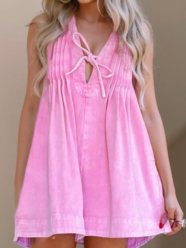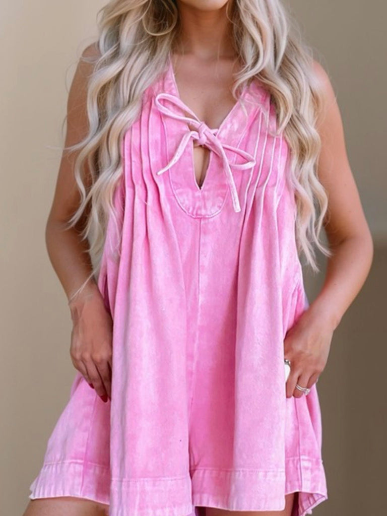 Flirty, fun, and effortlessly cool—the Blush Denim Romper is your new go-to for chic, laid-back style. Made from soft-washed denim in a dreamy blush pink hue, this romper features delicate pleated details, a playful tie-front neckline, and a relaxed, flowy fit that keeps you comfortable all day long. Whether you're strolling through town, brunching with friends, or heading to a festival, this romper is the perfect mix of sweet and sassy.