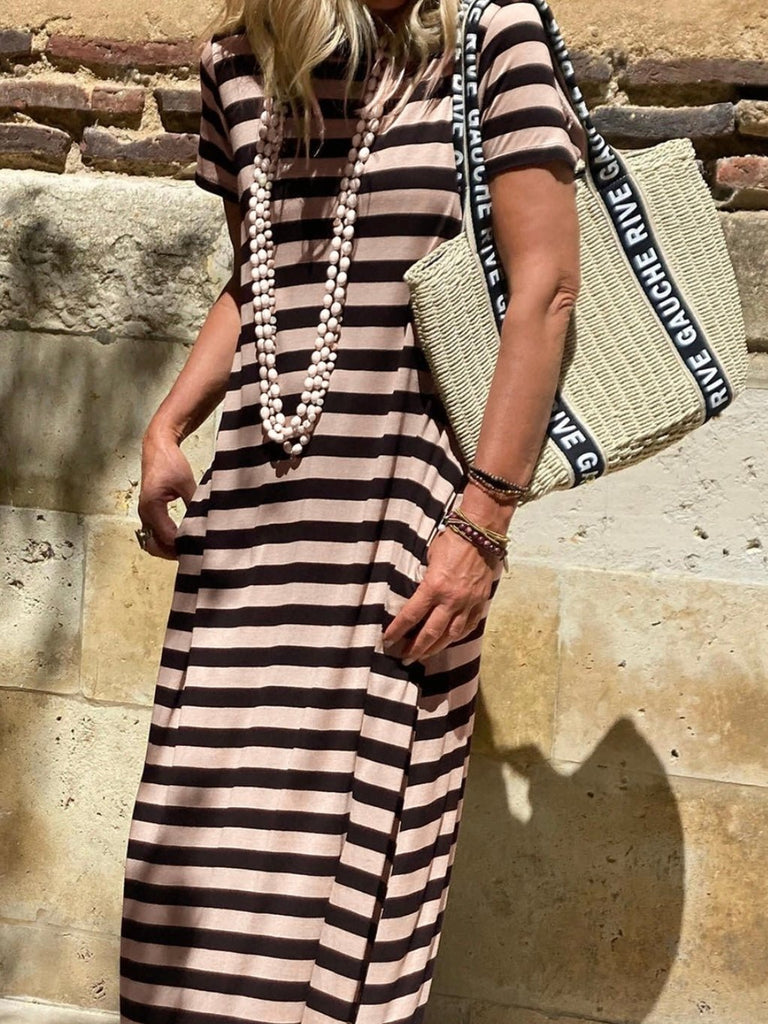 Effortless, chic, and oh-so-comfortable—the Cafe Stripe Maxi Dress is the ultimate go-to for laid-back elegance. Featuring a classic striped pattern in neutral tones, this dress is designed with a flattering maxi length, a round neckline, and short sleeves for an easy, breezy feel. And let’s talk about those pockets—because fashion should always be functional!