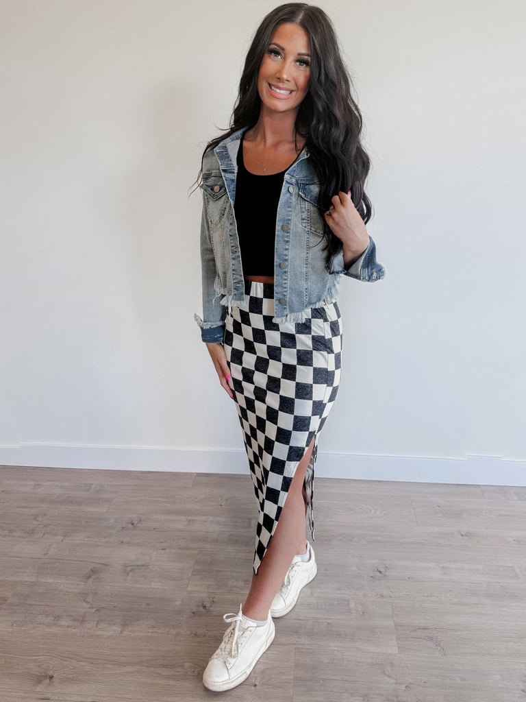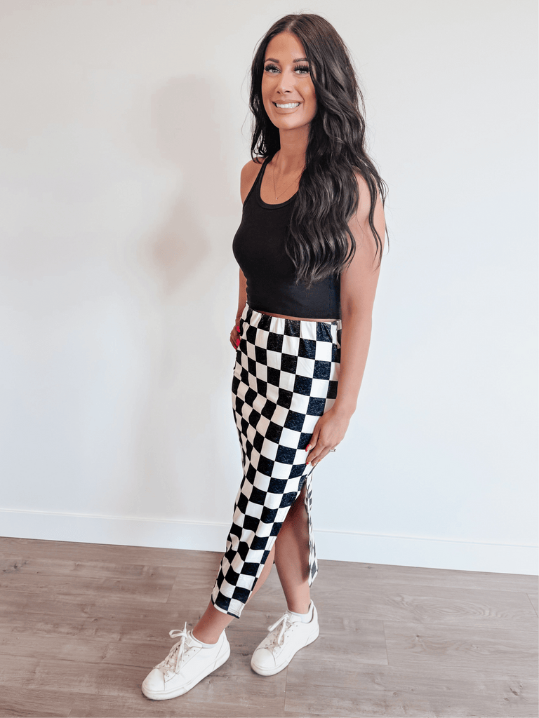 Make your move in the Checkmate Midi Skirt—a bold black-and-white checkered piece that brings instant attitude to your look. Designed with a curve-hugging fit and a daring side slit, this skirt is the perfect mix of edgy and chic. Pair it with a graphic tee and sneakers for street-style vibes, or dress it up with heels for a night out. Either way, you’ll be turning heads!