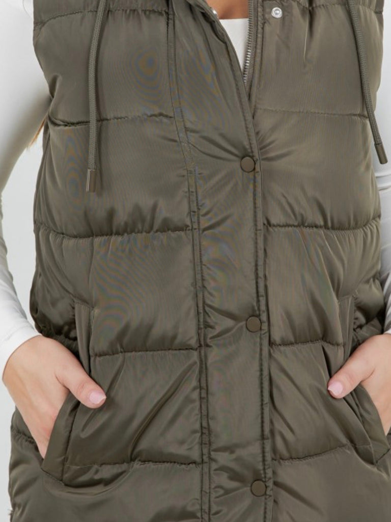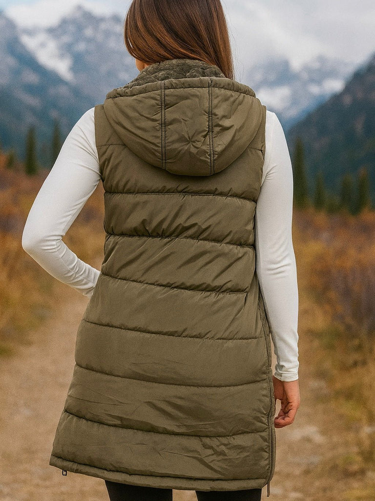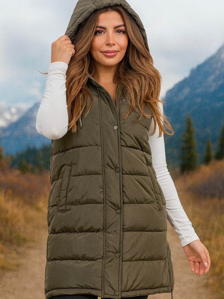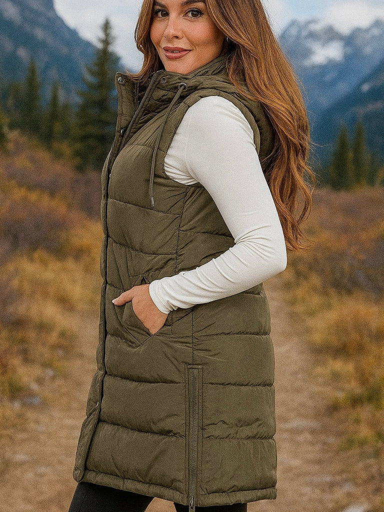 📌 olive puffer vest, women’s puffer vest with hood, long fall vest Canada, boutique outerwear