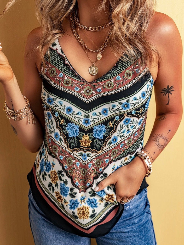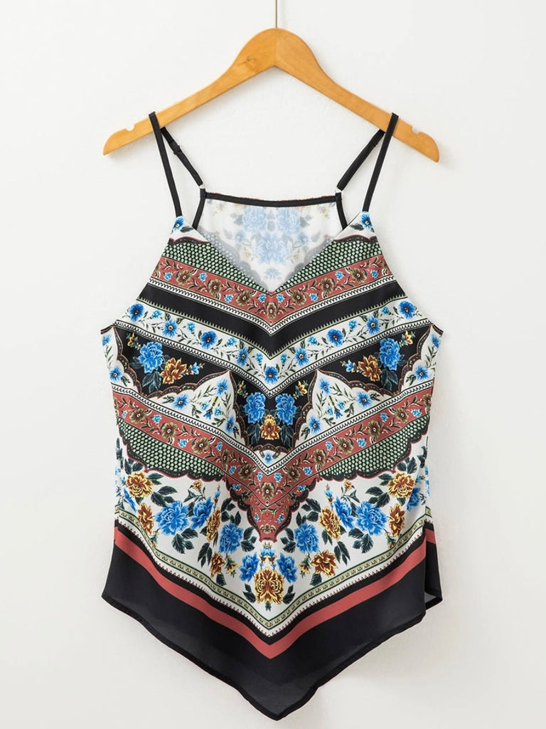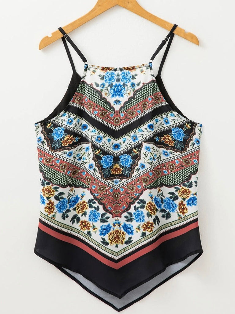 Step into boho festival vibes with the Festival Bandana Tank, a stunning mix of modern style and free-spirited charm. Featuring a chevron-inspired floral print, this handkerchief hem tank is designed for effortless movement and eye-catching appeal. The adjustable spaghetti straps ensure the perfect fit, while the lightweight 100% polyester fabric keeps you cool and comfortable in the summer heat. Whether you're dancing at a festival, strolling the beach, or layering it under a chic jacket, this statement top is your go-to for boho-chic styling.