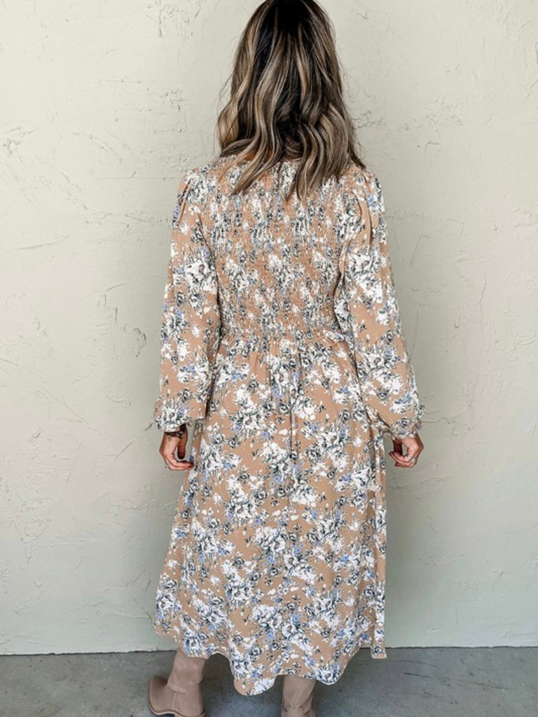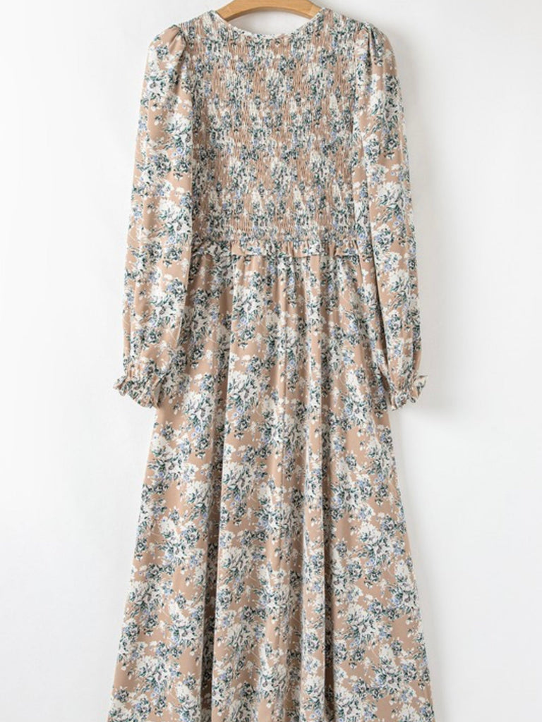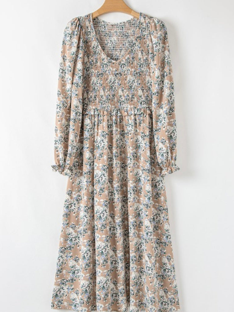 A dreamy blend of vintage charm and effortless boho style, the Hazel Bloom Dress is a must-have for your wardrobe. Featuring a soft floral print on a warm hazel-toned backdrop, this midi dress flows with every step. The smocked bodice provides a flattering fit, while the long sleeves with ruffle cuffs add a touch of romance. Whether you're strolling through the farmers' market or heading to brunch, this dress is your go-to for a relaxed yet feminine look.