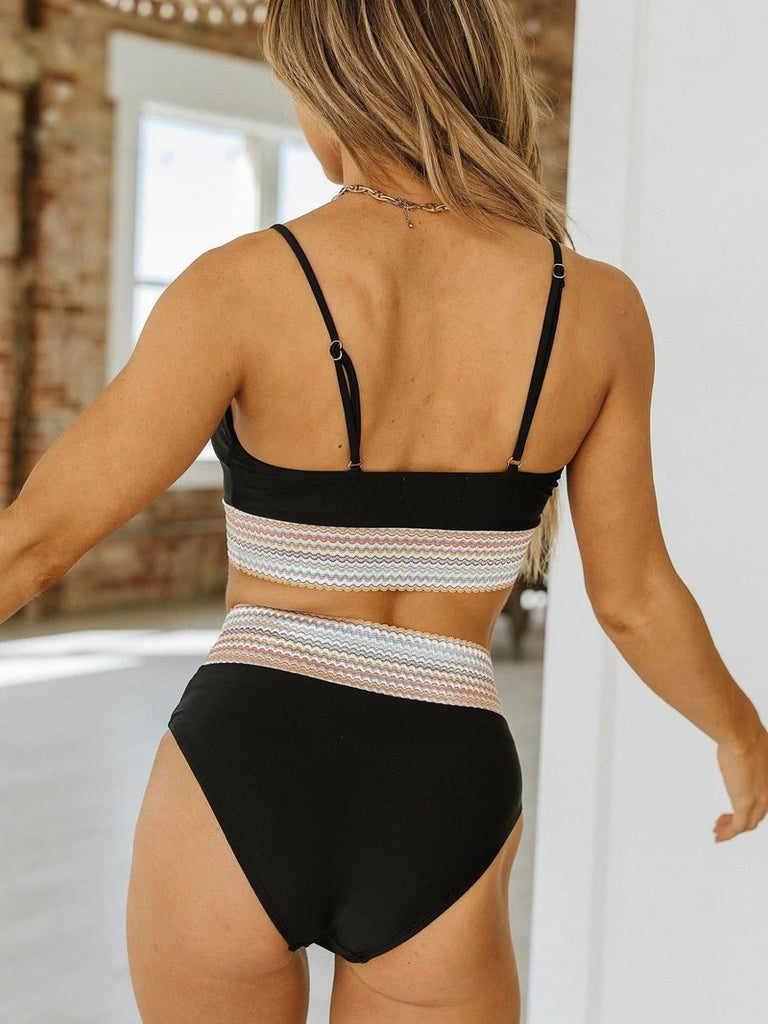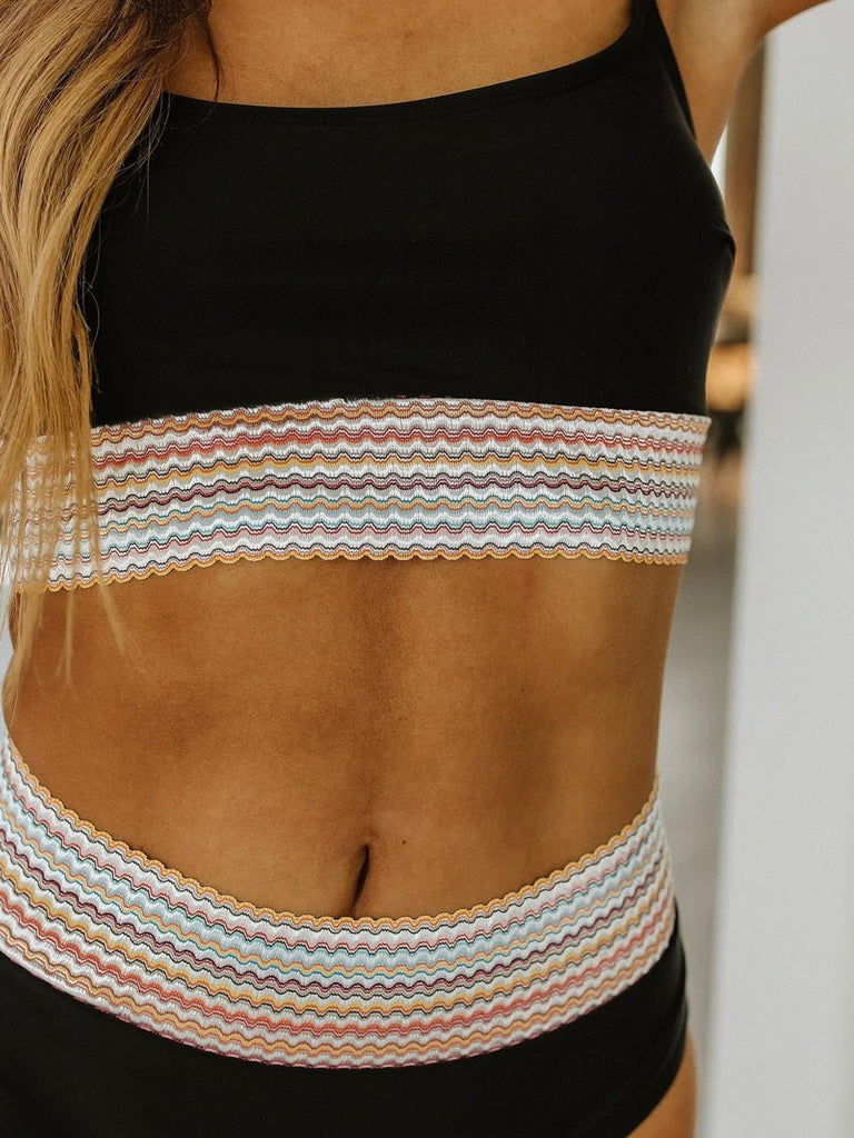 Make a splash in the High Tide Bikini, a sleek black swim set with eye-catching stripe accents that bring a playful, sun-loving vibe. Designed for both comfort and confidence, this two-piece features a spaghetti strap crop top with a supportive fit and a high-waisted bottom that flatters every curve. The striped elastic band adds a fun contrast, giving it a sporty-chic edge perfect for beach days, poolside lounging, and all your sun-soaked adventures.