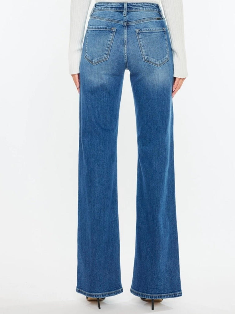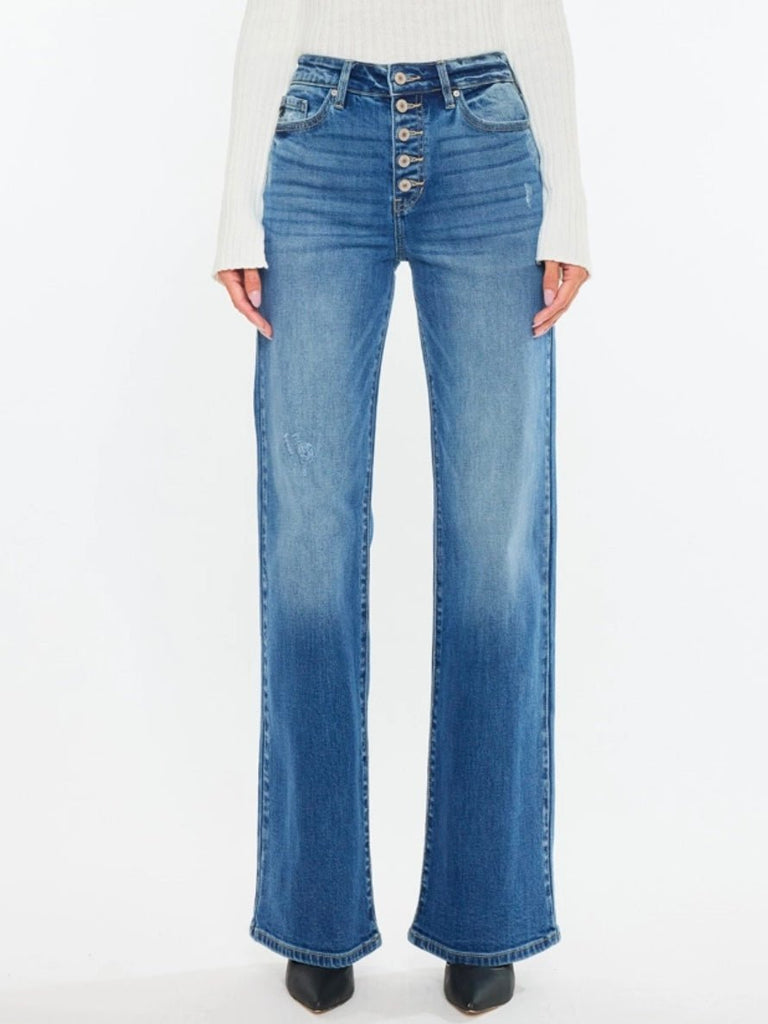 Our new Kennedy Ultra High Rise 90's Flare Jeans bring a timely look to your wardrobe. In a medium washed style crafted from soft denim that moves with you with ease. Featuring subtle distress details, 5-pocket design, and an exposed button fly closure.