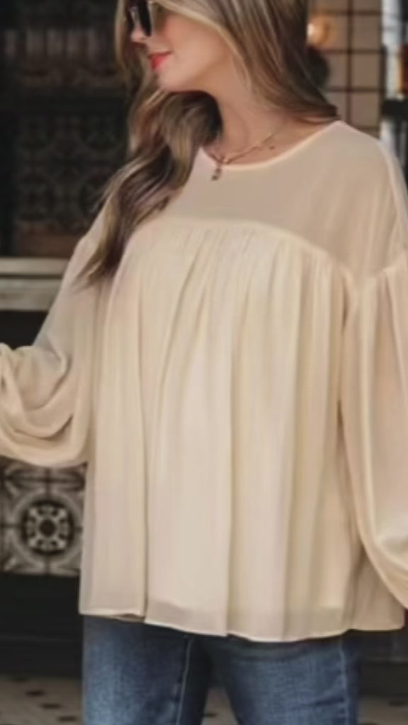 Soft, sheer, and totally chic — the Latte Glow Chiffon Blouse is your new neutral essential. With flowy balloon sleeves and a gathered yoke, it’s the perfect blend of sophistication and boho charm.