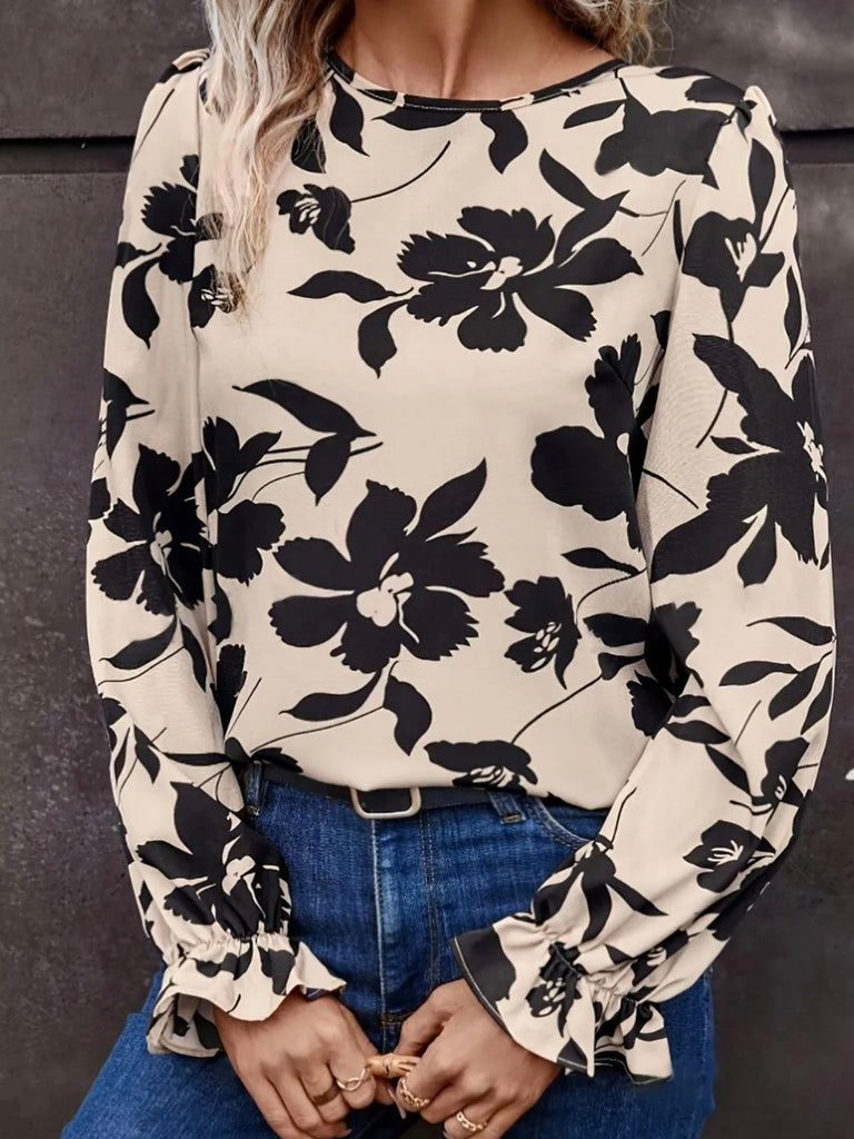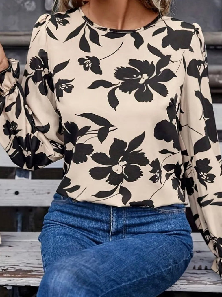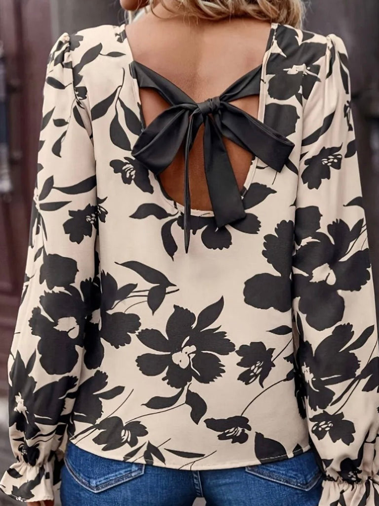Turn heads with the Midnight Boho Blouse, a sophisticated take on bohemian fashion. This blouse features a cream-colored base with bold black floral prints, creating a stunning contrast that exudes elegance. The back bow-tie detail adds a touch of feminine charm, while the long puff sleeves with elastic cuffs complete the look with a romantic flair.