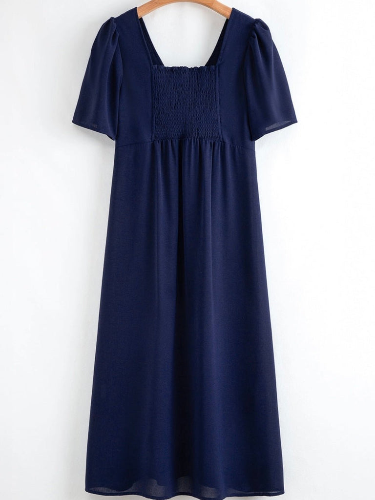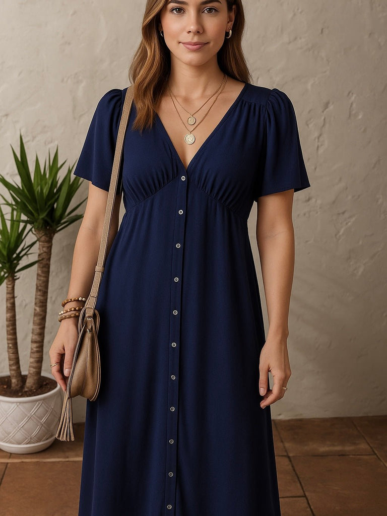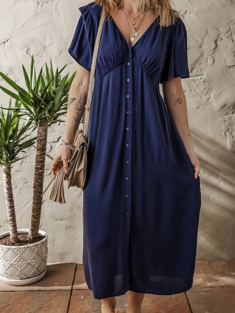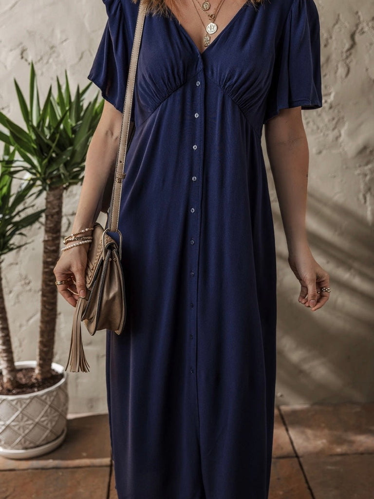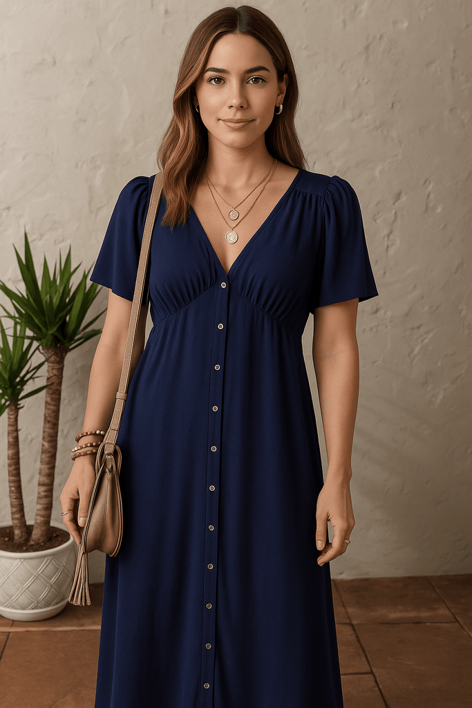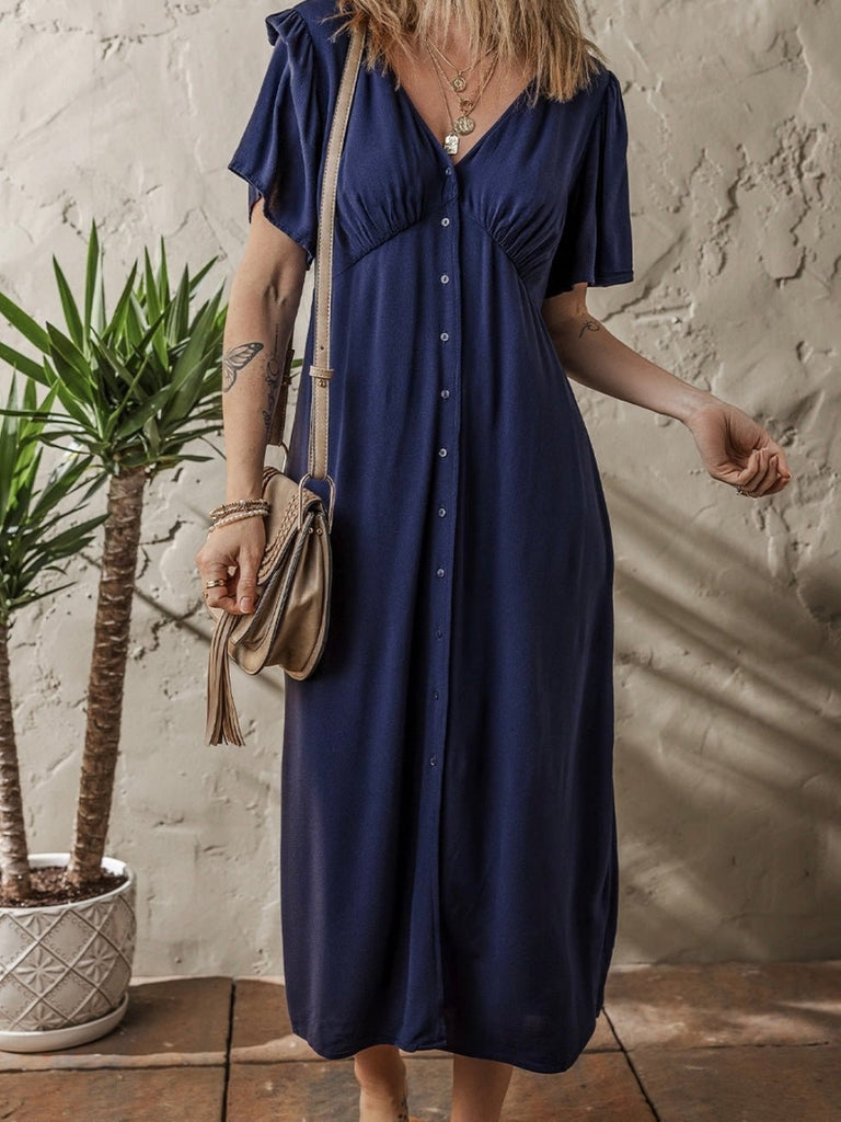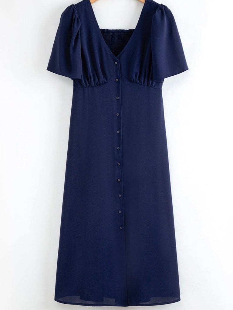 A soft navy midi that blends minimalism with elegance. Its button-down silhouette and flutter sleeves make it a timeless wardrobe anchor.