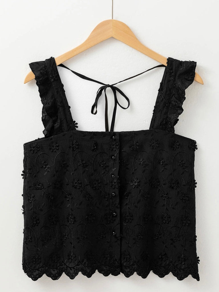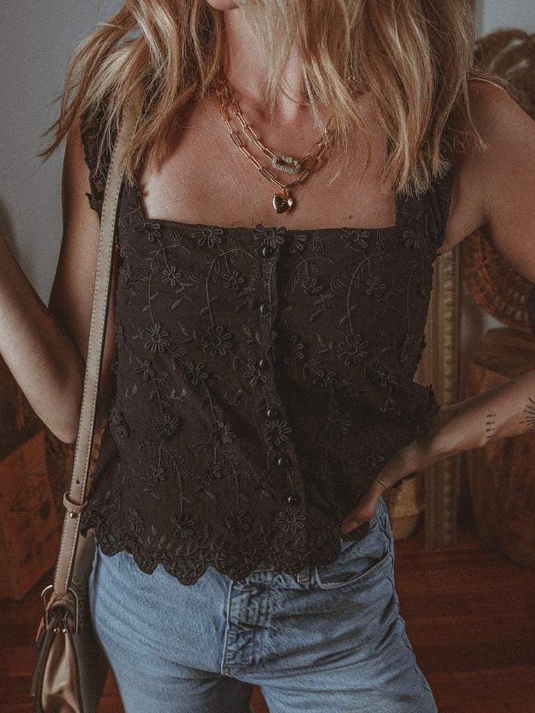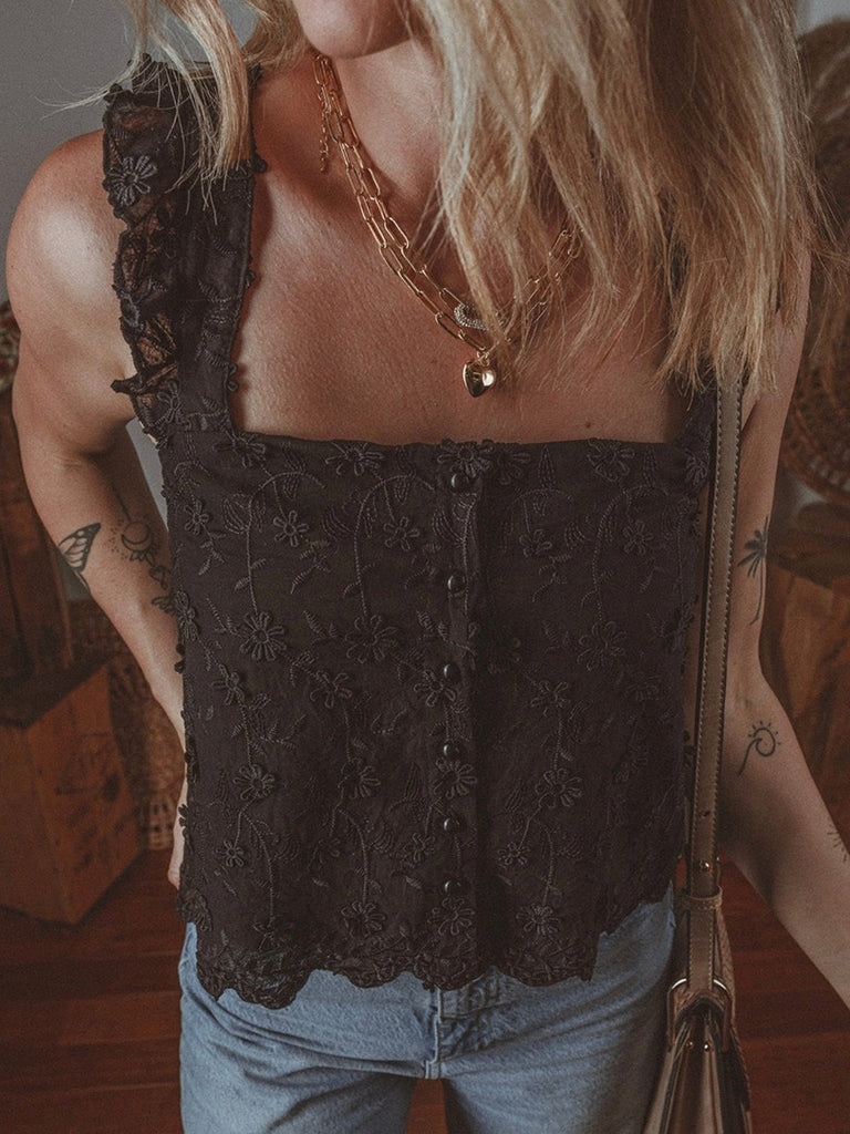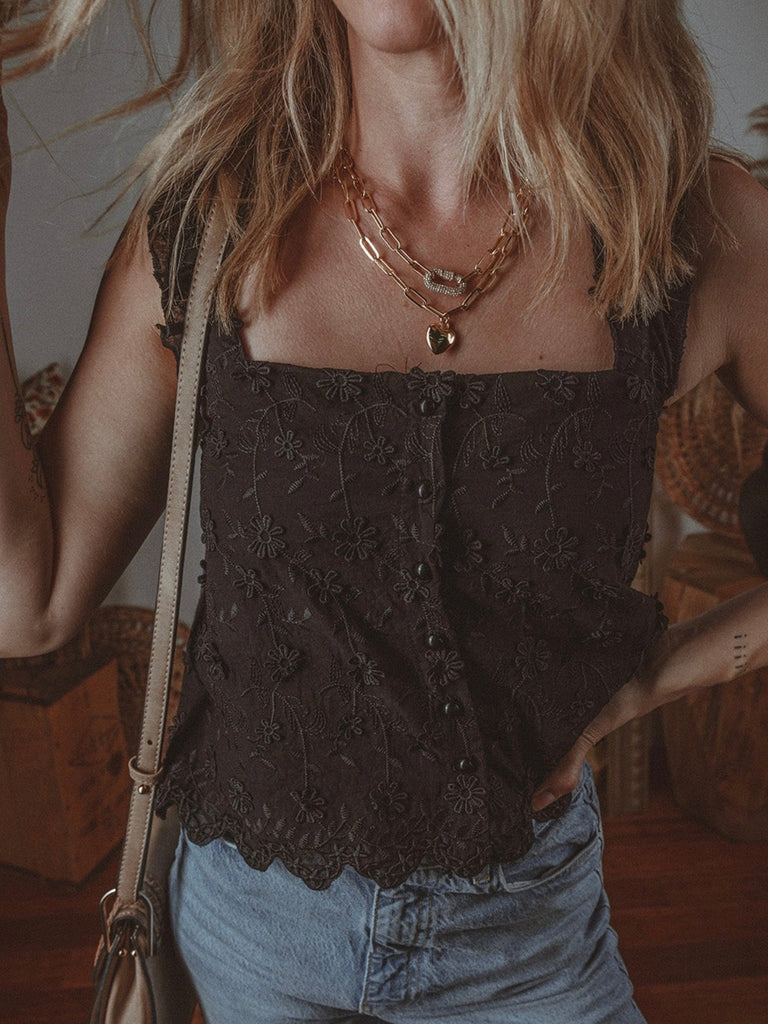 Upgrade your wardrobe with the timeless elegance of the Midnight Lace Camisole Tank. This chic top features intricate floral embroidery that adds a sophisticated touch to its classic design. The buttoned front detail enhances its vintage-inspired charm, while the breathable 100% cotton fabric ensures all-day comfort and durability.