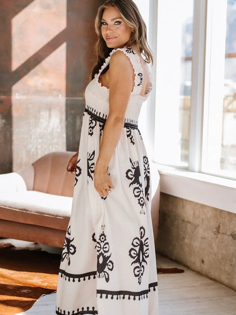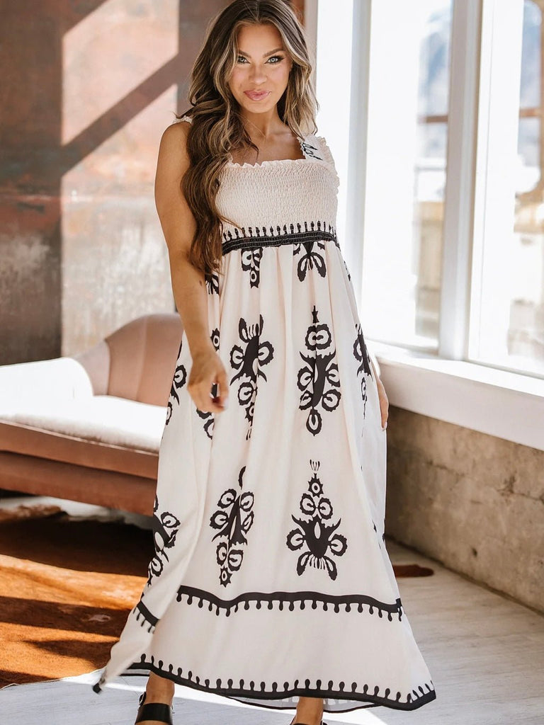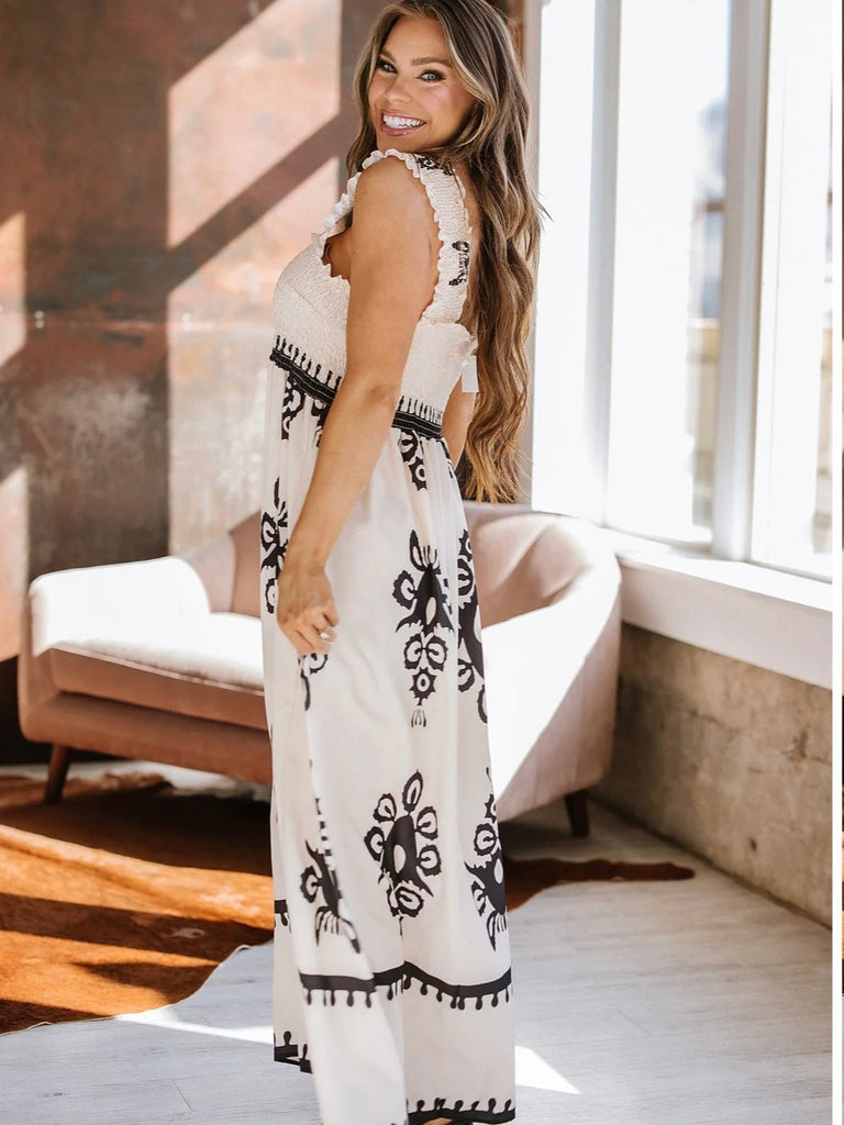 When bold meets timeless. The Monochrome Bloom Maxi Dress features striking black embroidery on soft ivory, with a smocked bodice that flatters every curve. Flowy, elegant, and perfect for making a statement without saying a word.