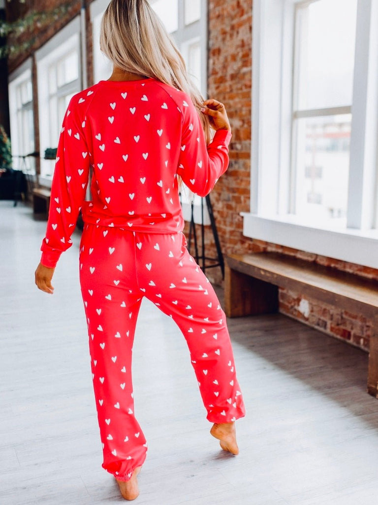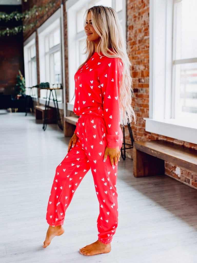Add a touch of romance to your wardrobe with our Passion Hearts Lounge Set. This fiery red two-piece outfit, adorned with crisp white hearts, is the perfect way to show some love—whether it’s for yourself or someone special. Made from luxuriously soft and cozy fabric, this set is designed for maximum comfort while keeping you stylish.