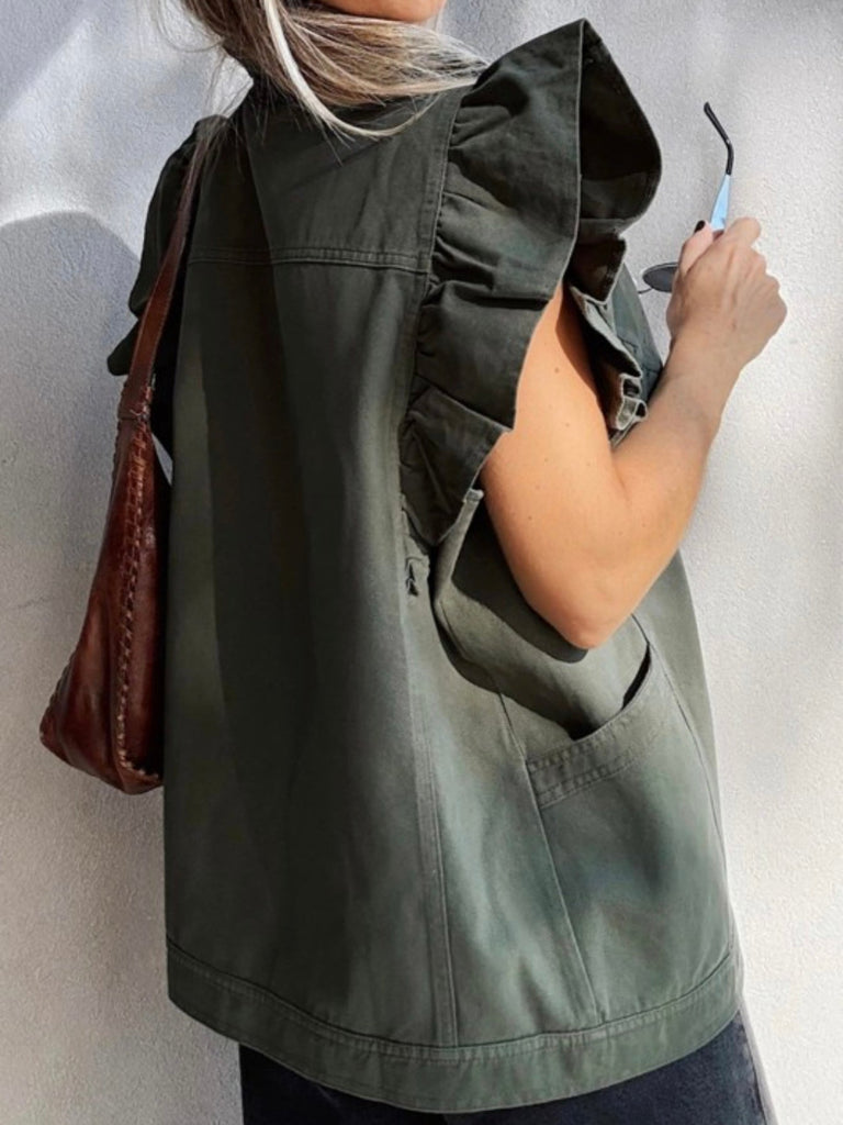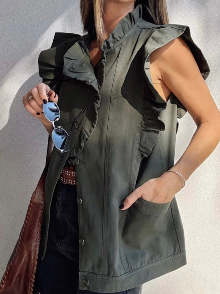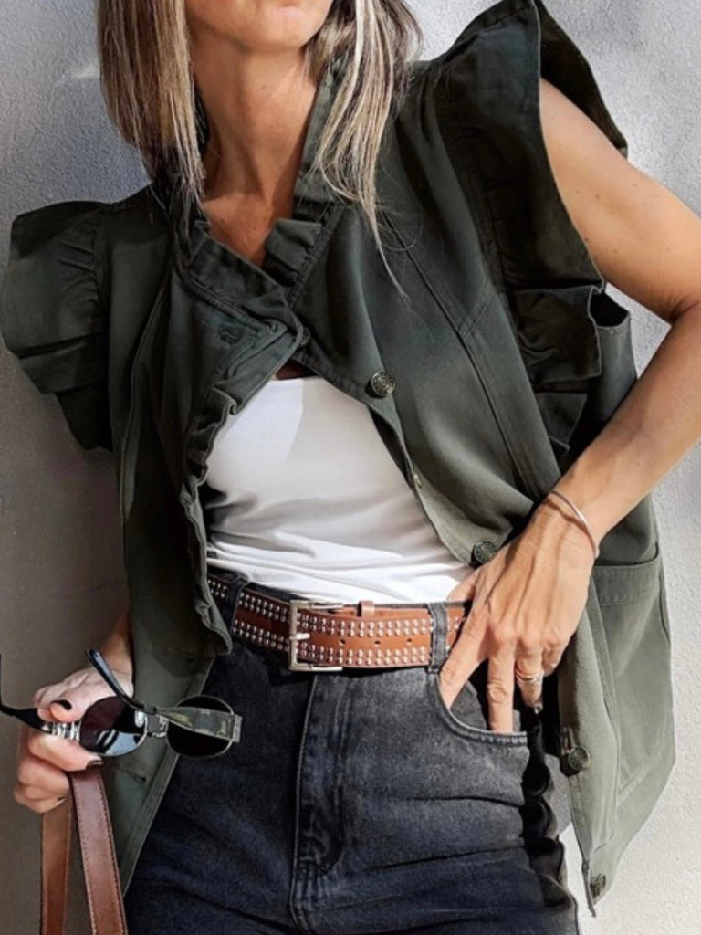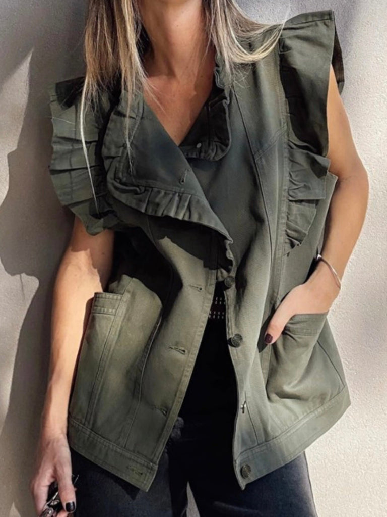 Olive green with edge—this sleeveless vest features oversized ruffle detailing and deep pockets, blending utilitarian cool with a romantic twist. Layer it over tanks, tees, or dresses to take your outfit from simple to standout.