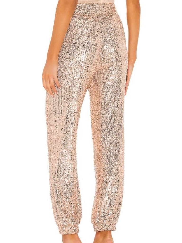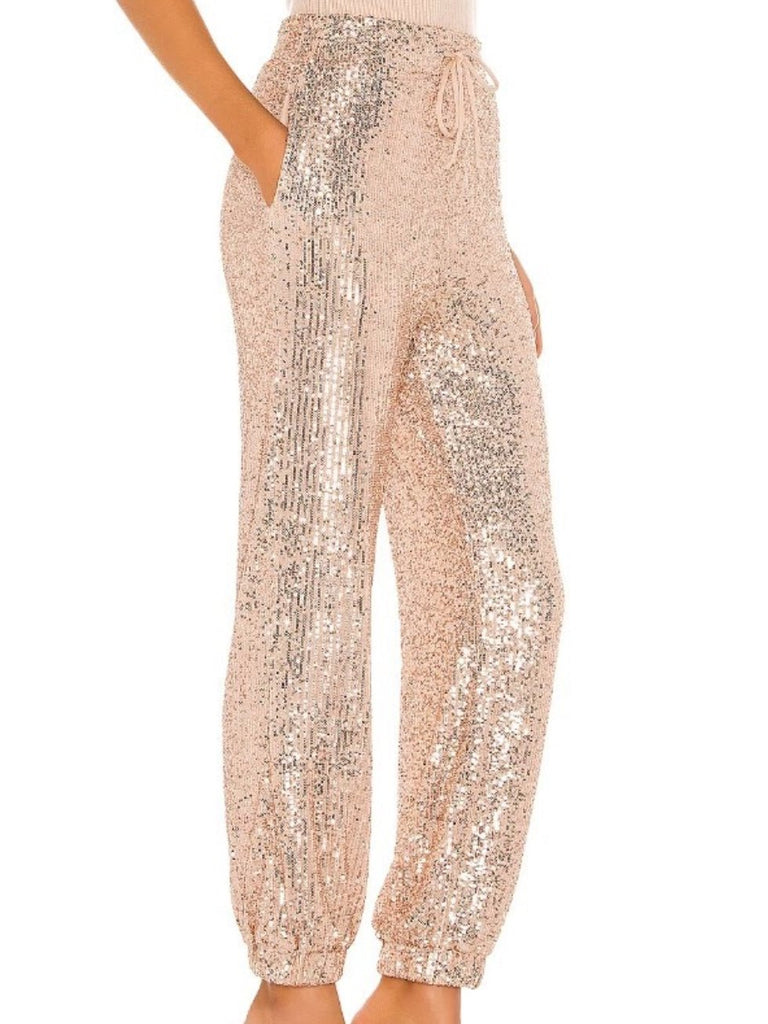 Its GLAM time! These Sequin Jogger in Rose Gold would look amazing with a bodysuit and blazer or cute off the shoulder top. These stretchy sequin jogger pants feature an elasticated waist band and ankle cuffs and side pockets.