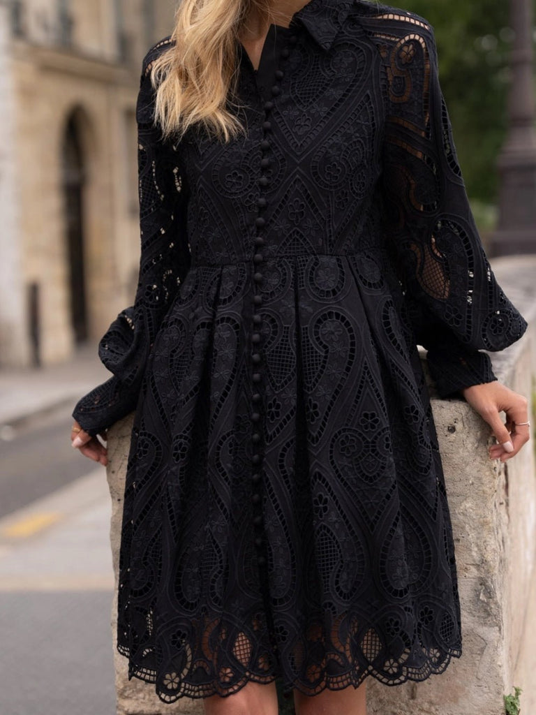 Step out in style with the Sloane Embroidered Cotton Lace Dress, with its stunning blouse collar, front buttons and slightly puffed long sleeves. The dress also features an adjusted and flared waist at the bottom for a flattering silhouette, and an inner lining for extra comfort - what more could you ask for? Pick your favorite color between black or ecru and get ready to take on autumn in the most sophisticated way!
