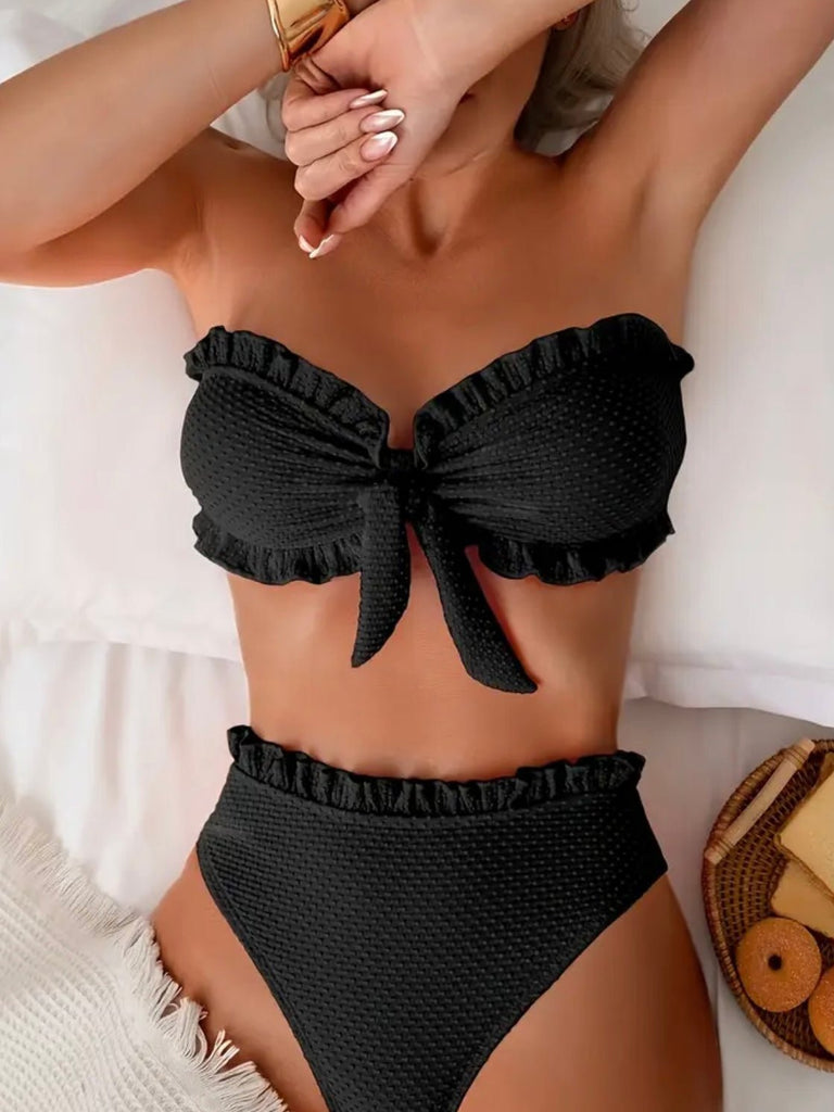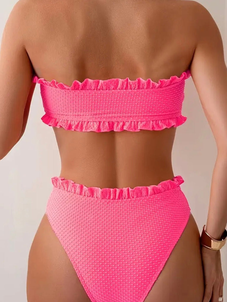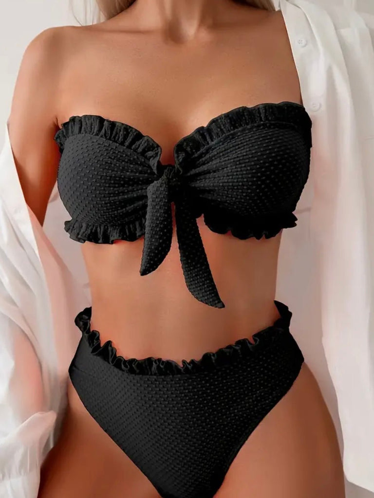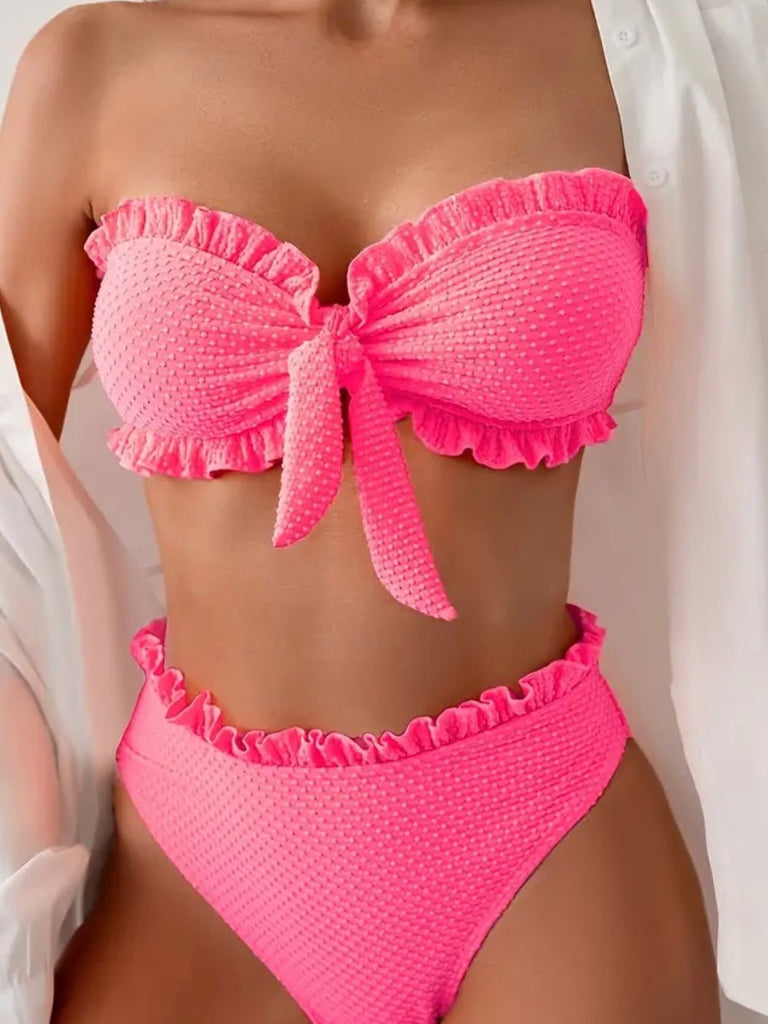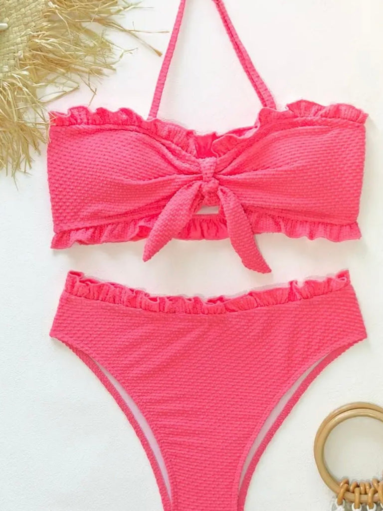 Turn up the heat in the Sunset Kiss Bikini, the perfect blend of playful charm and vintage-inspired glamour. This two-piece features a strapless bandeau top with a sweet tie-front detail, framed by dainty ruffled edges for a romantic touch. The high-waisted bottoms provide a flattering fit with matching ruffle trim, giving off major retro-chic vibes. Whether you choose the bold pink for a sun-kissed glow or the classic black for effortless elegance, this bikini is made for basking in golden-hour perfection.