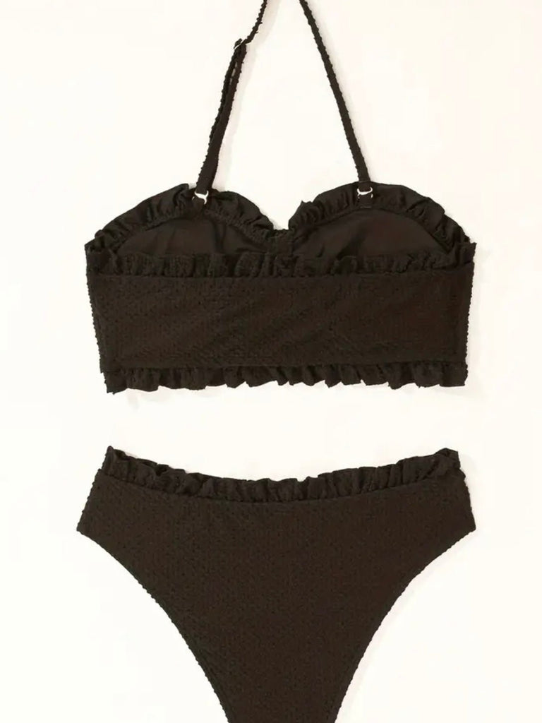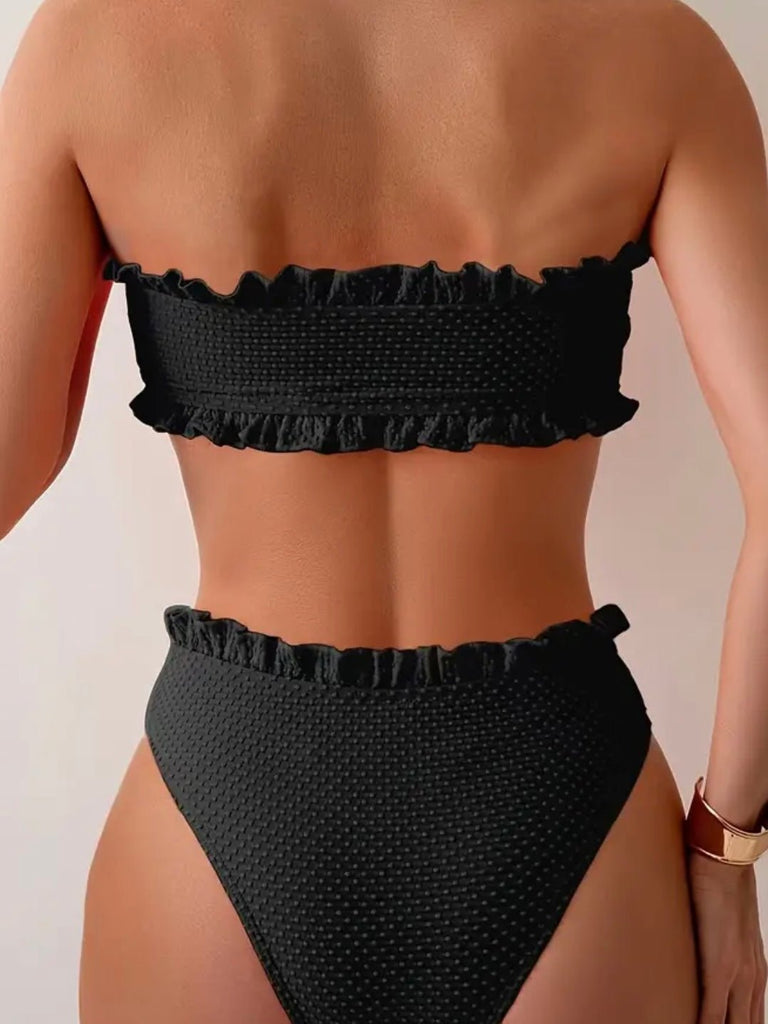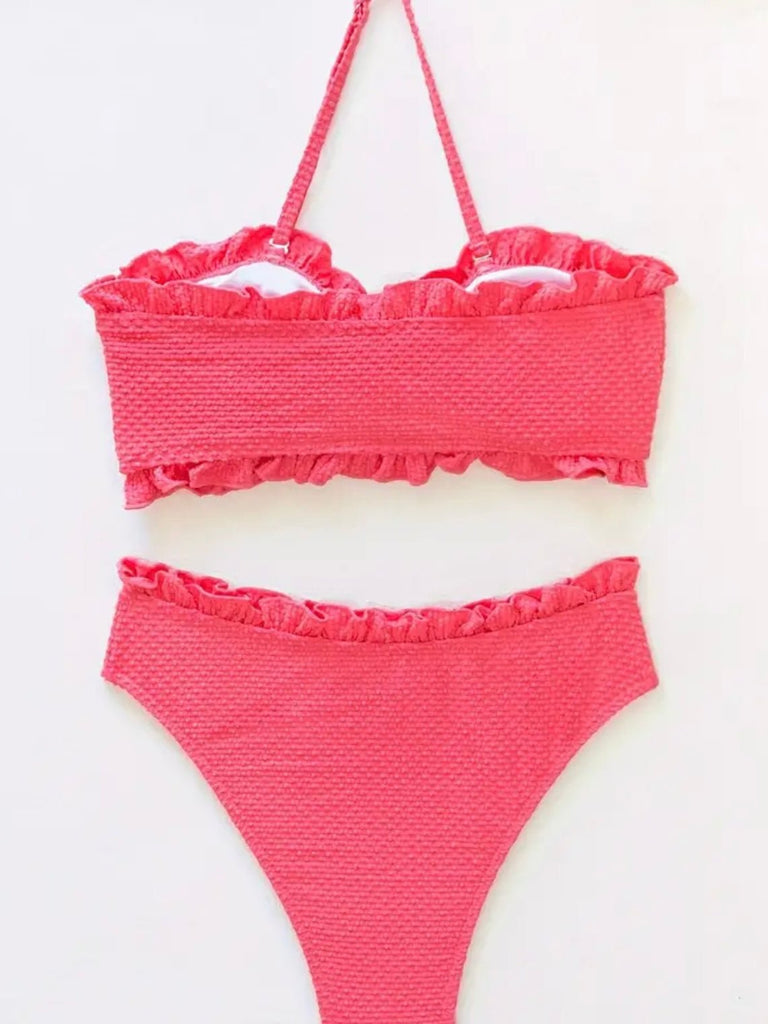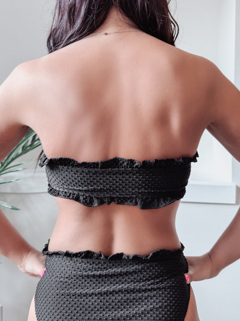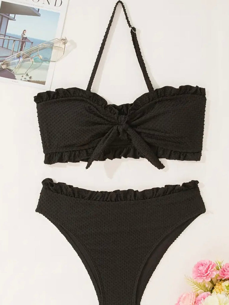 Turn up the heat in the Sunset Kiss Bikini, the perfect blend of playful charm and vintage-inspired glamour. This two-piece features a strapless bandeau top with a sweet tie-front detail, framed by dainty ruffled edges for a romantic touch. The high-waisted bottoms provide a flattering fit with matching ruffle trim, giving off major retro-chic vibes. Whether you choose the bold pink for a sun-kissed glow or the classic black for effortless elegance, this bikini is made for basking in golden-hour perfection.
