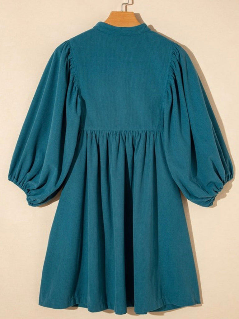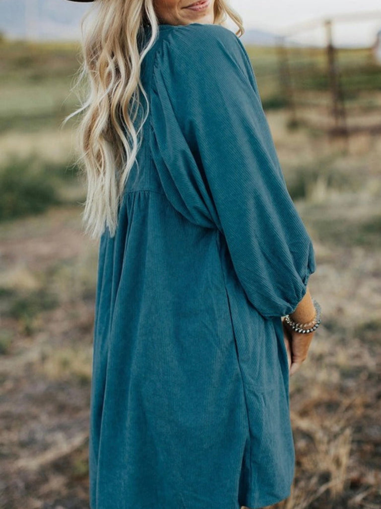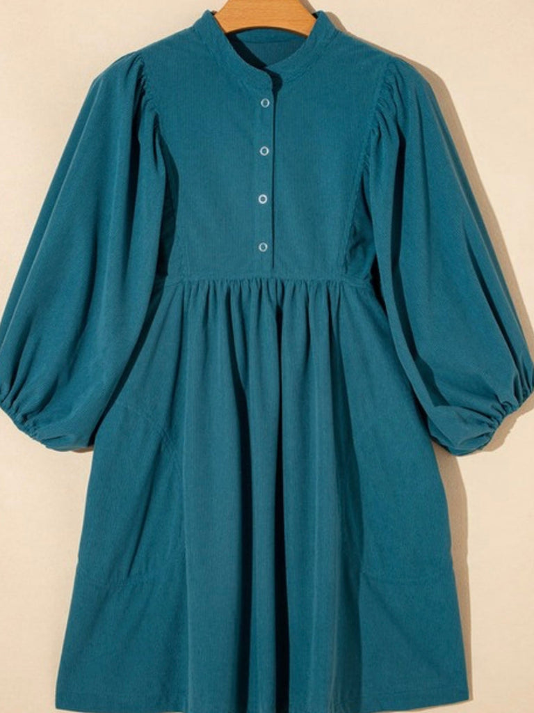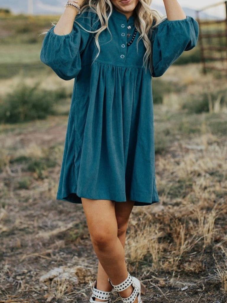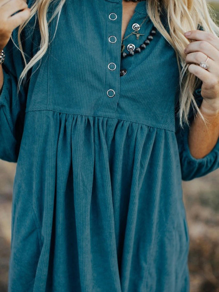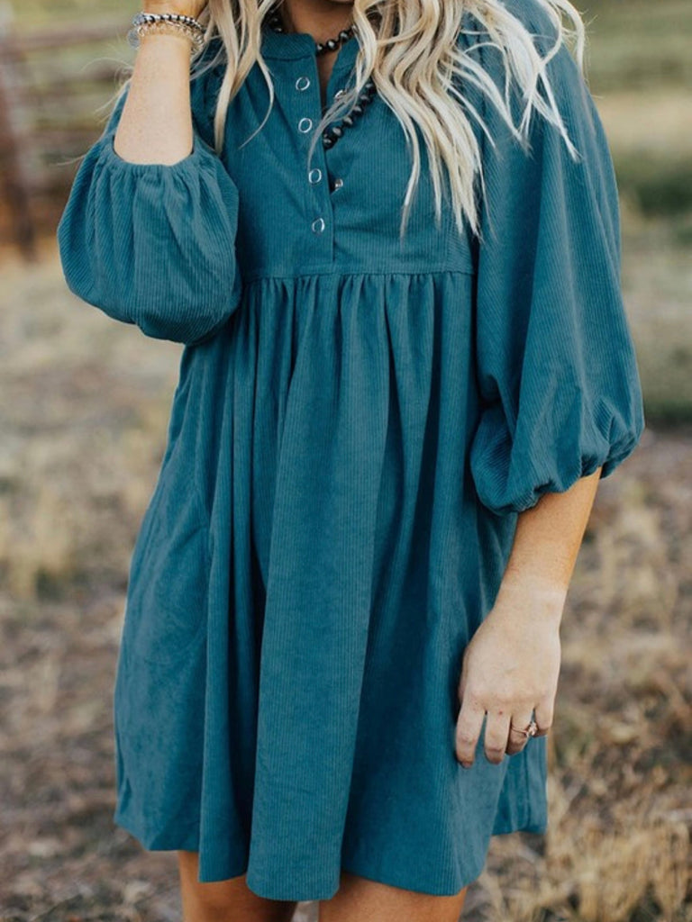 If you’re searching for the perfect fall babydoll dress that’s as comfy as it is cute, this teal blue dress is your new go-to. With its boho puff sleeves and button neckline, it’s ideal for winery weekends, fall photoshoots, or dressing up with boots for Thanksgiving dinner.