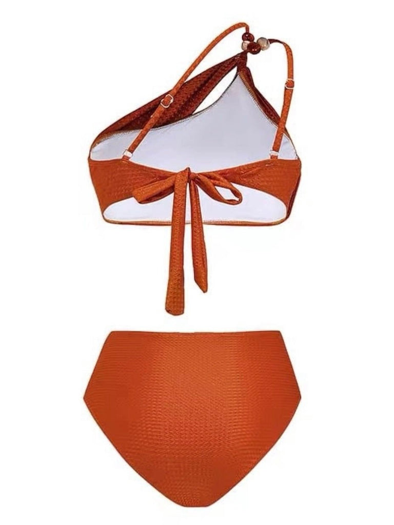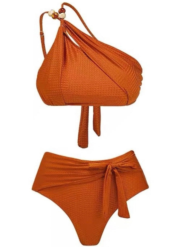 Turn heads in the Terracotta Tide Bikini Set, a stunning swimwear trio designed for effortless beachside elegance. Featuring a one-shoulder bikini top with chic bead detailing, high-waisted tie bottoms for a flattering fit, and a flowy tropical-print sarong, this set is all about sun-kissed sophistication. The warm terracotta hue channels earthy, boho vibes, while the wrap-style details add a touch of effortless luxury—perfect for lounging by the waves or strolling along the shore.