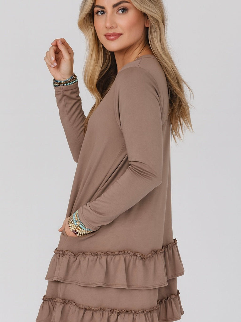 Flirty, feminine, and oh-so-versatile, this mini dress is designed to be your new go-to. The scoop neckline highlights your natural shape, while the tiered ruffled hem adds that playful movement we all love. A hidden side pocket gives it a practical edge (because yes, style can have storage). The soft neutral tan hue makes it perfect to wear solo with boots or sandals, or layered under a tunic for added length and dimension.