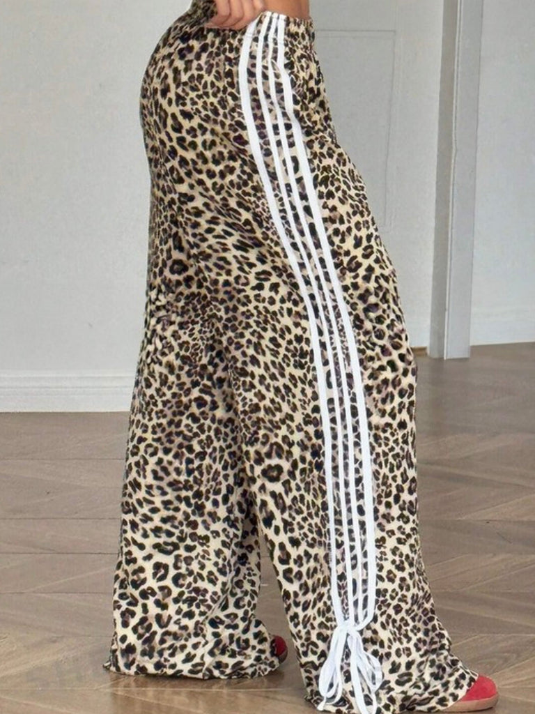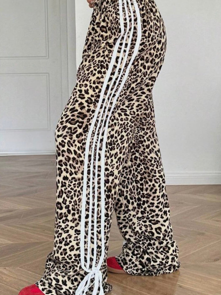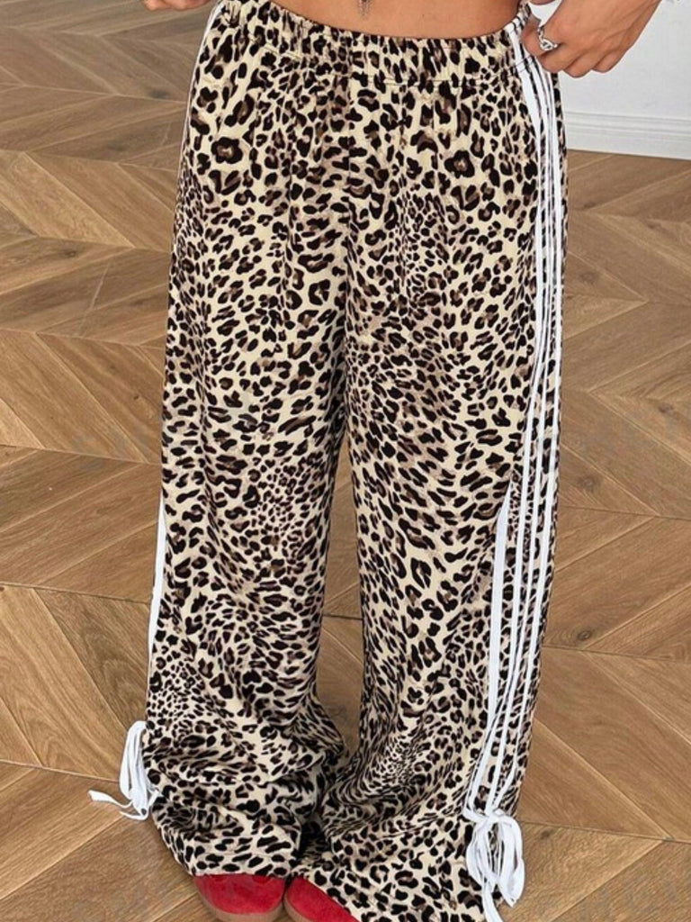 These wide leg stunners feature a bold leopard print, white varsity side stripes, and statement bow tie hems for that perfect mix of fierce and fun. With a relaxed fit and adjustable waist, they’re made for days when you want to turn heads without sacrificing comfort.