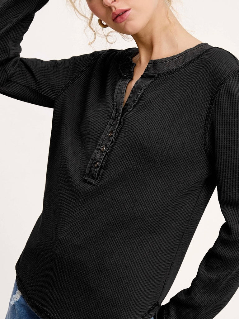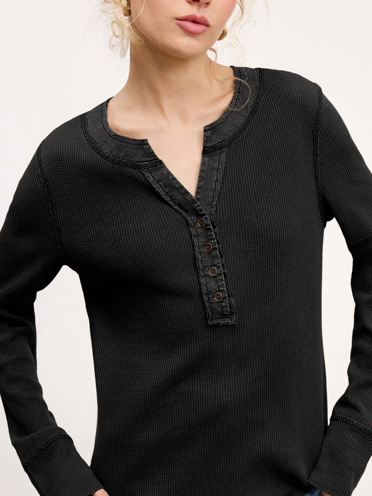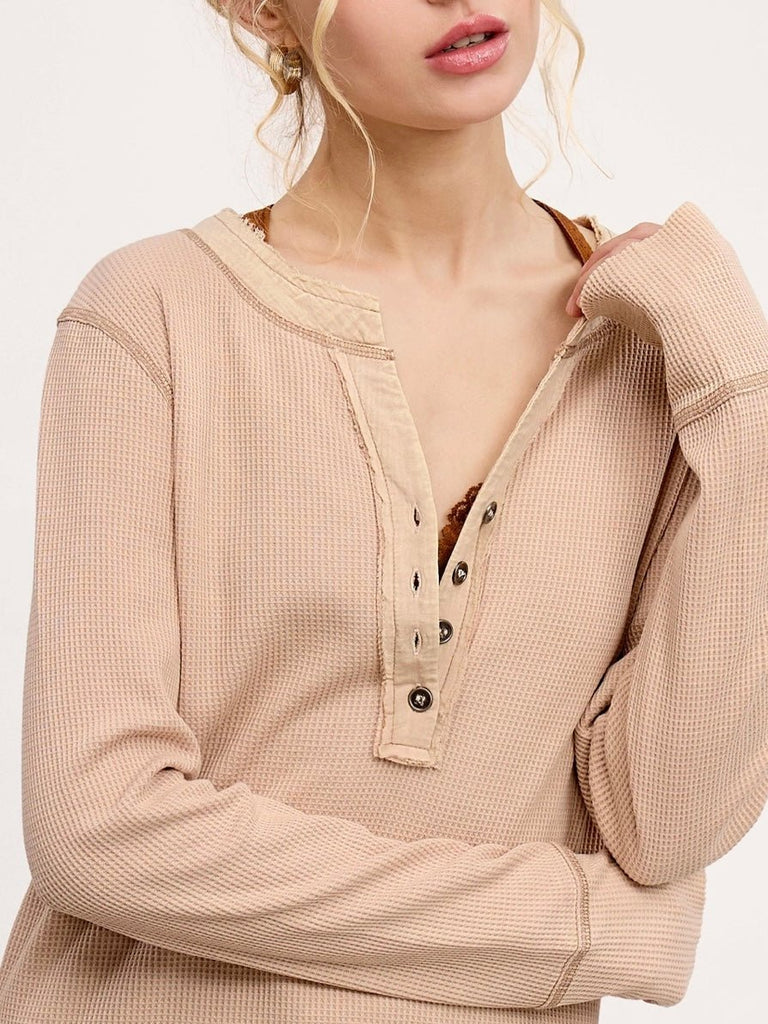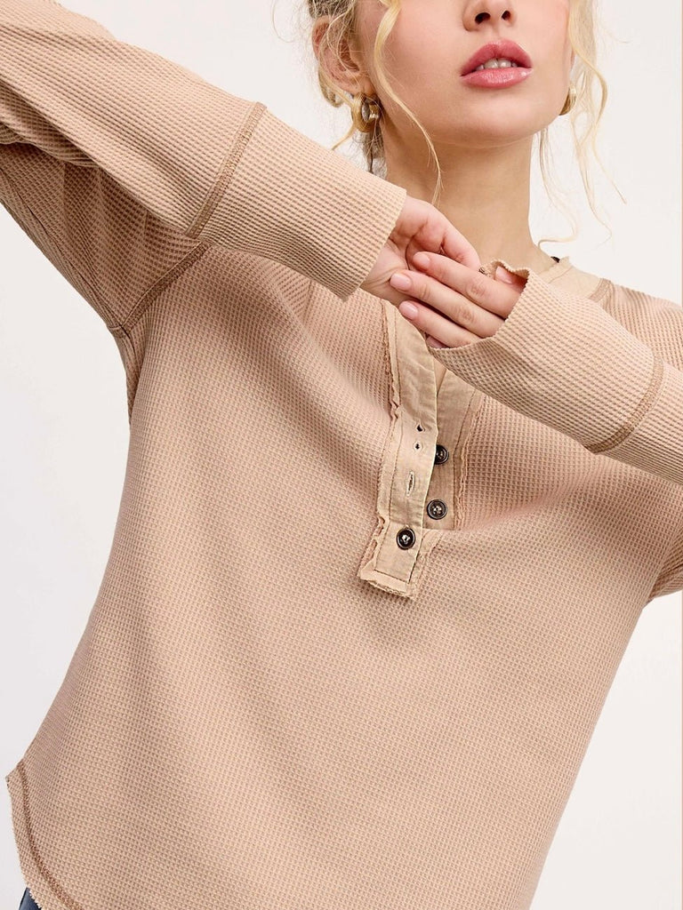 Trending Keywords: waffle henley, thermal top, vintage washed top, layering essential, button front long sleeve, waffle knit shirt, raw edge henley, boho basics, boutique waffle knit