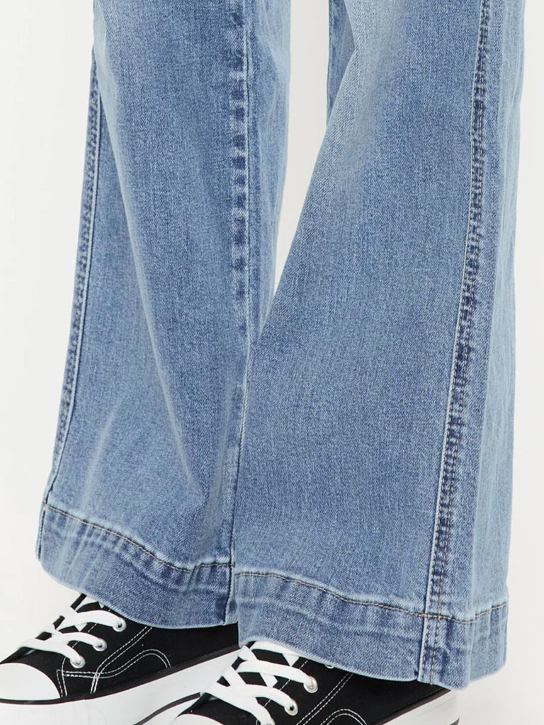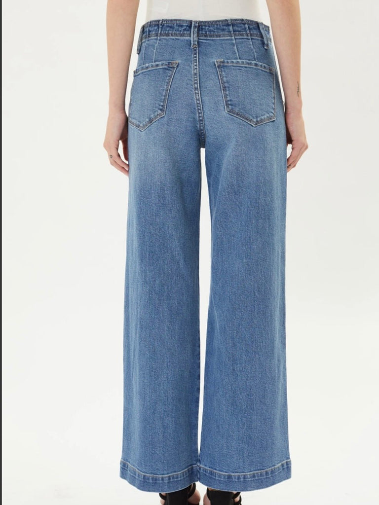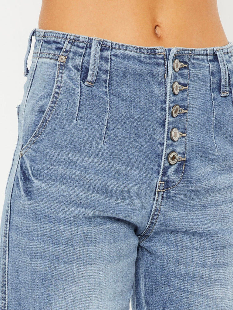 Get the edgy yet sophisticated look with our Zoey Wide Leg Jeans. Made with comfort stretch denim, these medium-washed jeans sit high above the waistline for a roomy fit. Moderate destruction on both legs and unique four-pocket design add to the trendy appeal. We love the 5 button effortless style!