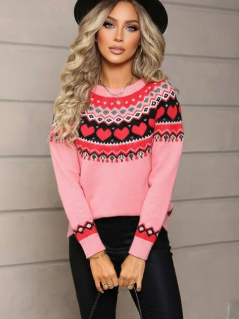 Bring a little joy to chilly days with this pink heart-patterned sweater. The mix of geometric and heart designs gives it a playful yet timeless charm.