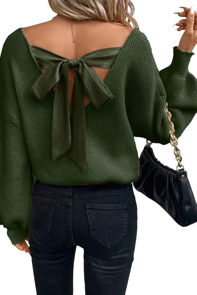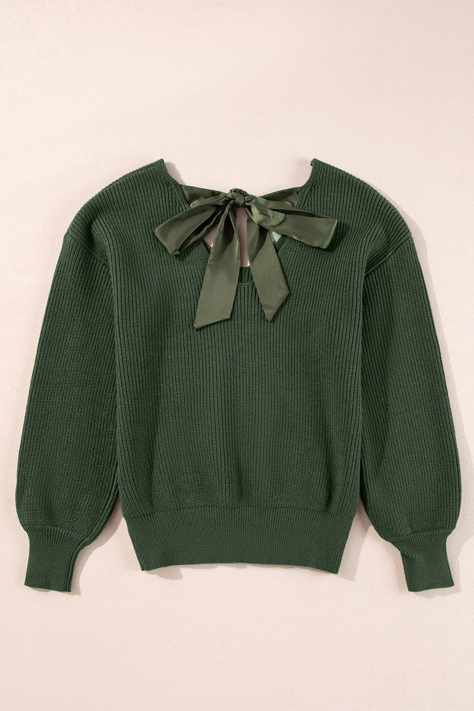 Unleash your fashion-forward side with our Tie The Back Sweater. This chic piece features stylish lantern sleeves and a flattering V-neck design that adds a touch of elegance to any outfit. The unique knot detail at the back, along with the open back that ties up with a ribbon, brings a playful and sophisticated twist to your look. Whether you're dressing up for a date night or keeping it casual for daily wear, this sweater is your new go-to for effortless style.