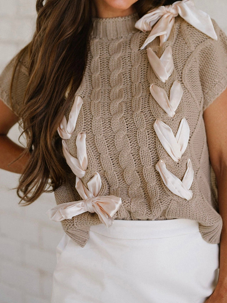 Redefine cozy chic with the Elegance Entwined Sweater. This short-sleeve beauty combines classic cable-knit texture with a modern color-block design for a fresh and stylish update. The delicate satin bowknot details add a feminine touch, making this sweater an effortlessly elegant choice for any wardrobe.