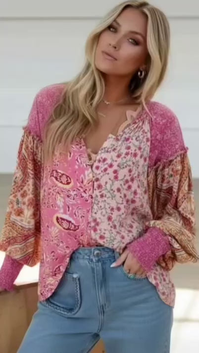 When your outfit needs a little something—but you still want it to feel easy—this blouse delivers. The Botanical Mosaic V-Neck Blouse blends soft florals and flowy texture into a statement piece that looks styled the moment you put it on, no extra effort required.