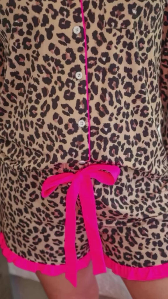 Unwind in fierce style with the Wild at Heart Lounge Set. This soft leopard-print two-piece features a pop of hot pink trim for that perfect mix of cozy and bold. The button-up top and matching drawstring shorts make lounging feel luxurious, while the contrast piping adds a playful, confident edge.