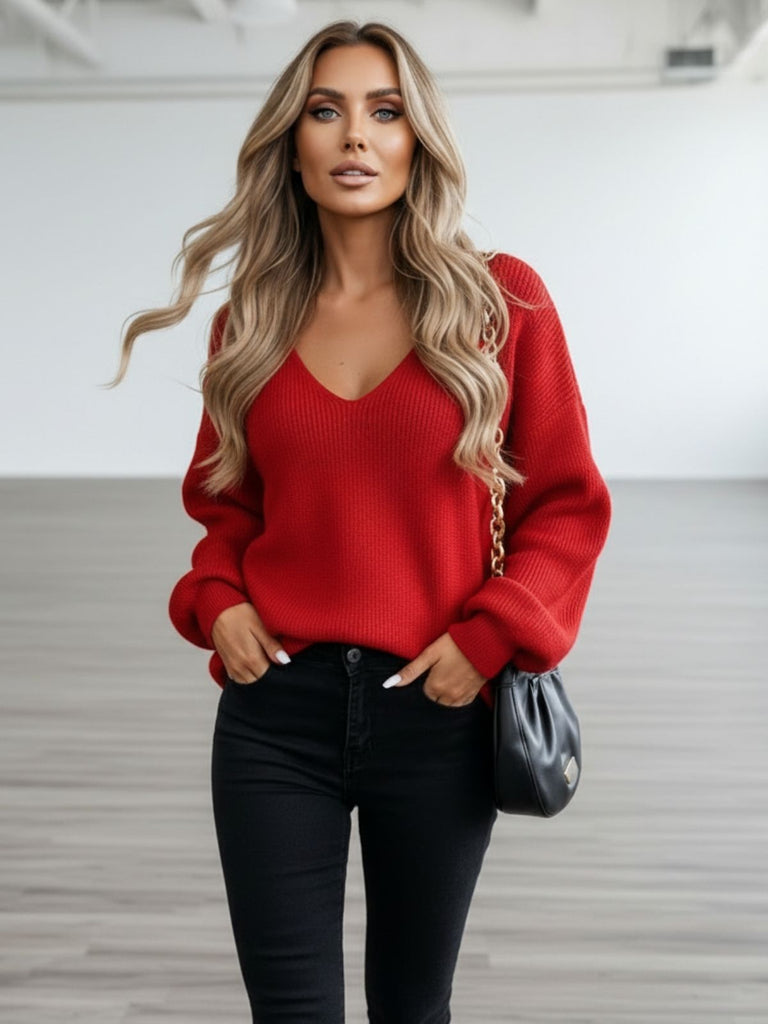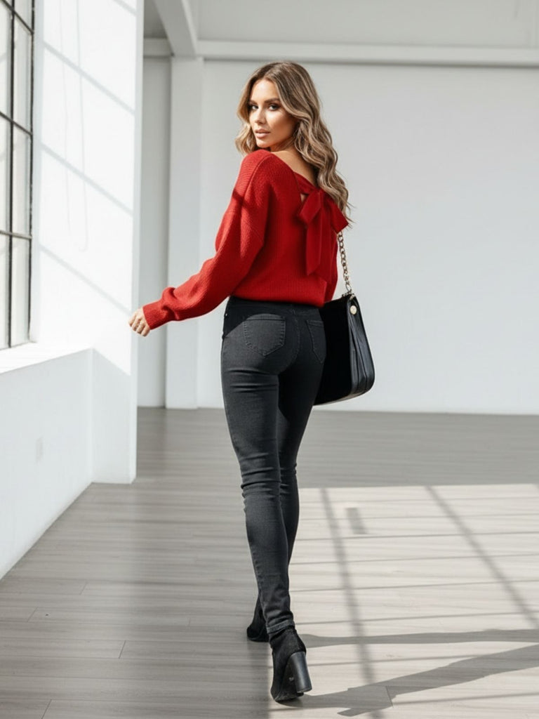 Unleash your fashion-forward side with our Tie The Back Sweater. This chic piece features stylish lantern sleeves and a flattering V-neck design that adds a touch of elegance to any outfit. The unique knot detail at the back, along with the open back that ties up with a ribbon, brings a playful and sophisticated twist to your look. Whether you're dressing up for a date night or keeping it casual for daily wear, this sweater is your new go-to for effortless style.