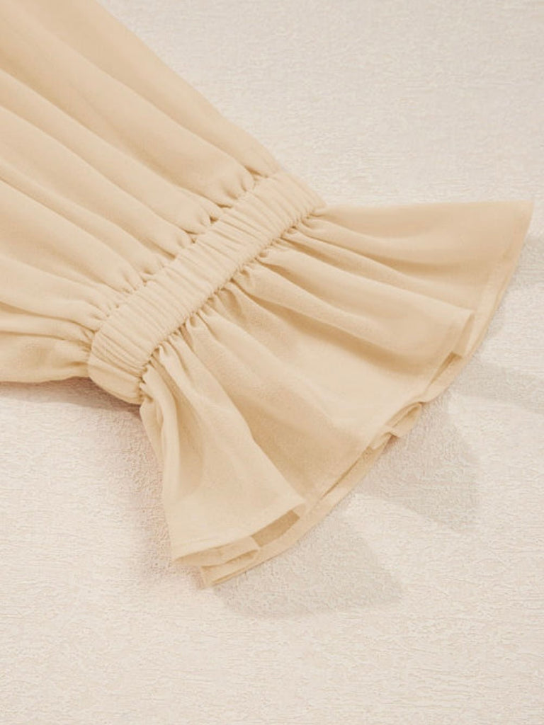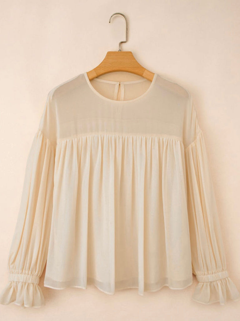 Soft, sheer, and totally chic — the Latte Glow Chiffon Blouse is your new neutral essential. With flowy balloon sleeves and a gathered yoke, it’s the perfect blend of sophistication and boho charm.